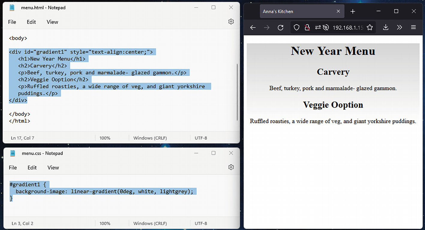 Throughout the book, we’ll explore HTML and CSS with worked examples and lab exercises for you to complete yourself. We’ll also introduce JavaScript and how it can be used to add interactivity to a website, as well as using content management systems such as WordPress. For this purpose, we’ve included all the source code for this book in the following repository: https://github.com/Apress/The-Absolute-Beginner-s-Guide-to-HTML-and-CSS