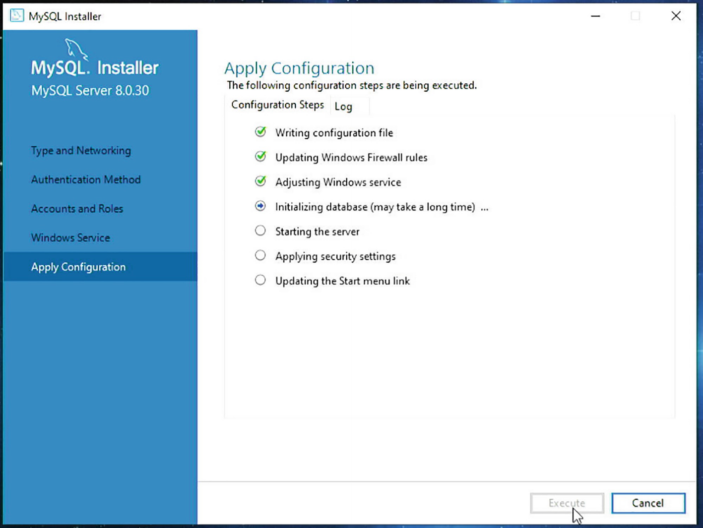 A screenshot of the My S Q L Installer page. It highlights the option for applying configuration on the left panel. The right part of the screen provides the details of the configuration steps. some of them include writing configuration files, updating the windows firewall rules, and adjusting windows service.