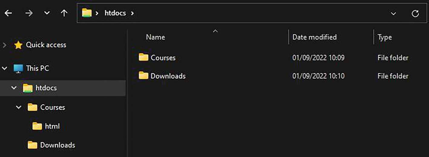 A screenshot of the file explorer. The quick access, this P C with h t docs, courses, h t m l, and downloads options are on the left. The main screen has the name, date modified, and type of the 2 folders, course, and downloads.