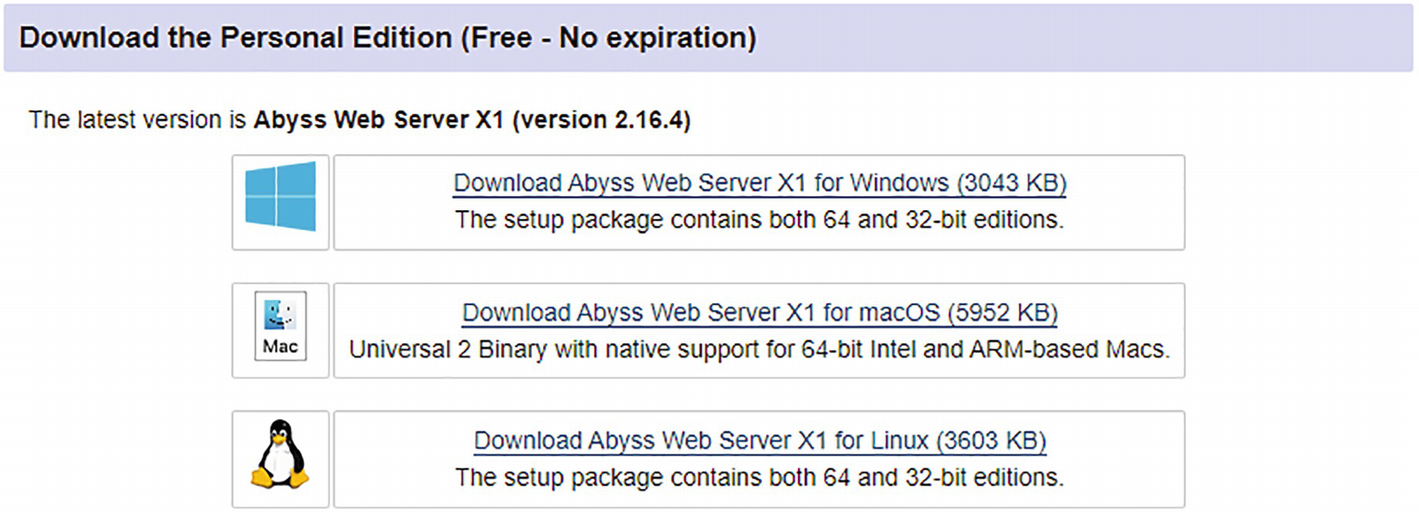 A screenshot of the personal edition download. The latest version of Abyss Web Server X 1 version 2.16.4 has 3 options of download Abyss Web Server X 1 for Windows, macOS, and Linux.