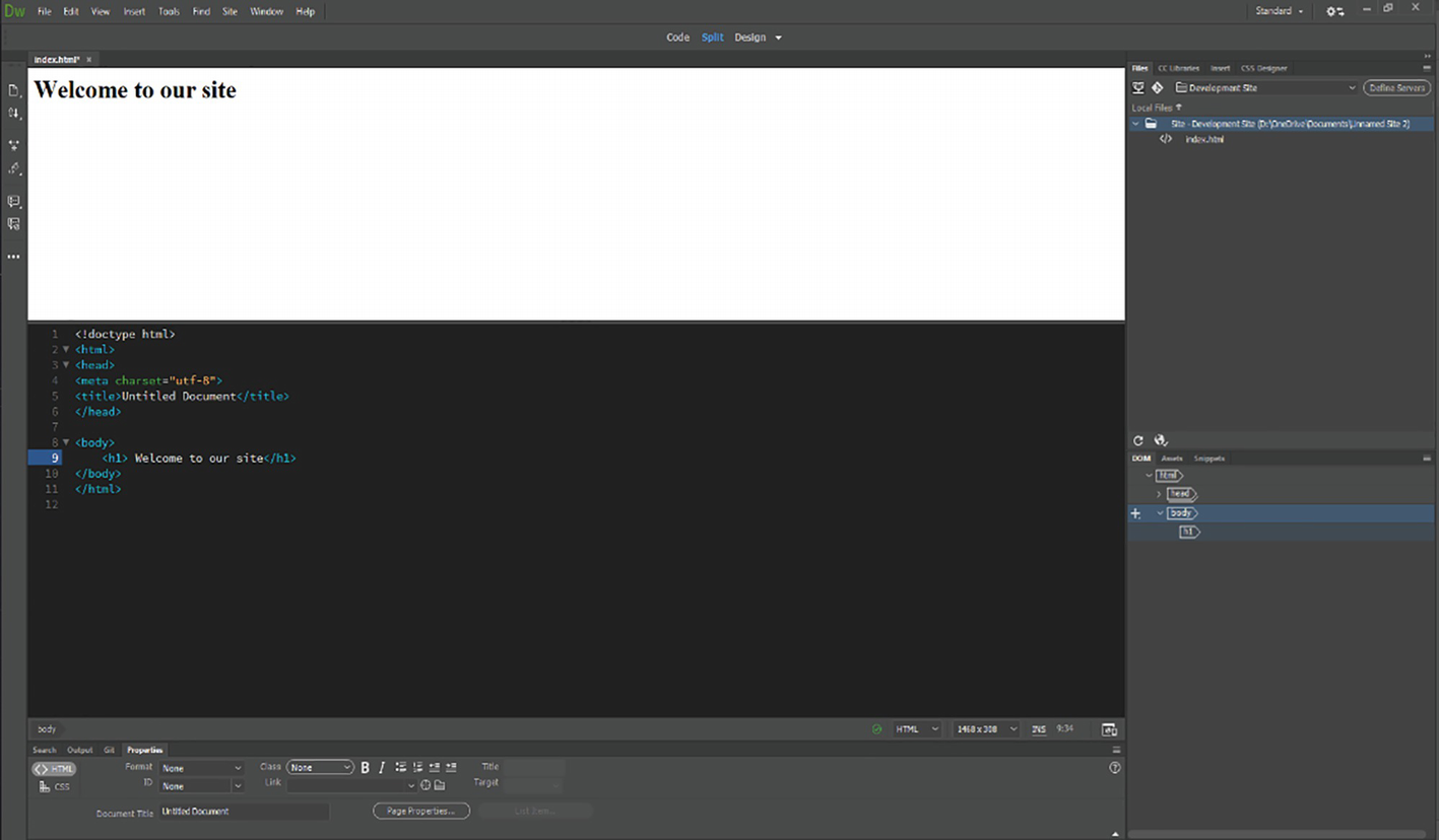 A screenshot of the Adobe Dreamweaver I D E screen. The code is under the text, Welcome to our site. The menu bar includes file, edit, view, insert, tools, window, and help options at the top. The options of code, split, and design are at the center. The page properties are at the bottom.