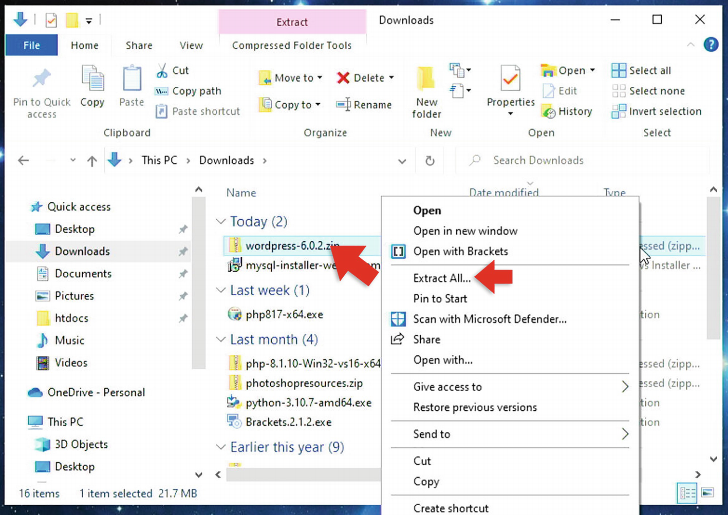 A screenshot of the file explorer window. It indicates a file named WordPress 6.0.2 dot zip in the downloads folder. A context menu indicates the option to extract all.