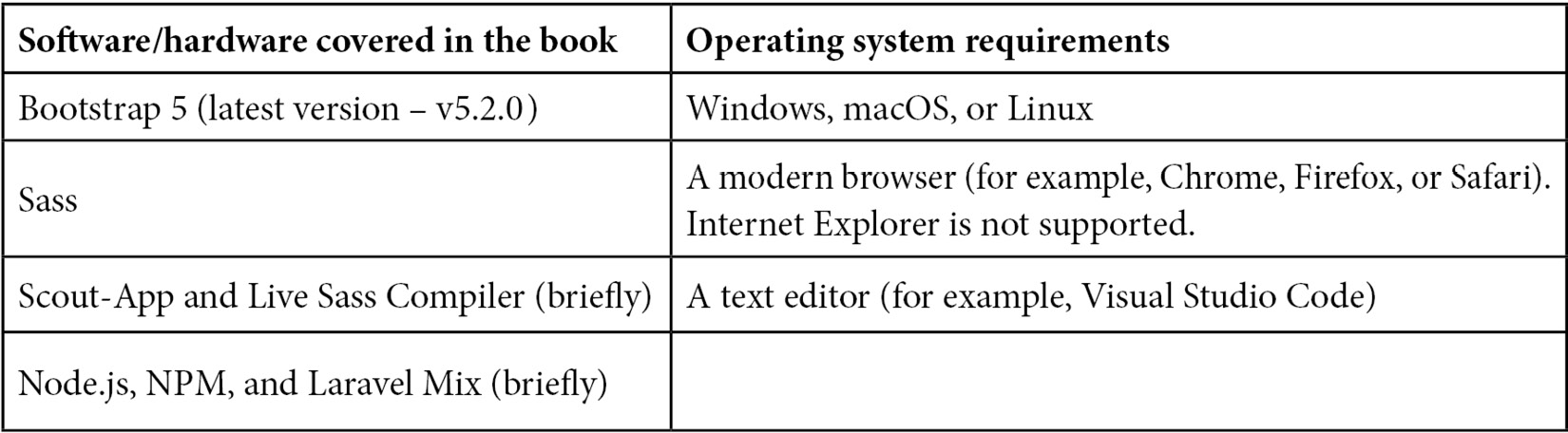 This book is written with the latest version of Bootstrap in mind: v5.2.0, generally referred to as Bootstrap 5 throughout the book. Some of the features and techniques described in this book might also work with Bootstrap 4 but probably not Bootstrap 3.