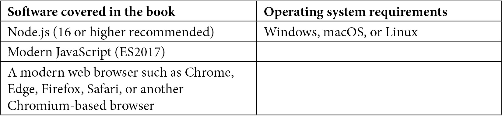 In the first six chapters, we are assuming that all JavaScript code runs in a Node.js environment, for example, in a server-side application or using frameworks such as Electron. The minimum version of Node.js that is capable of running every code sample in this book is 15; however, we recommend using Node.js 16 (the current LTS as of writing) or higher.