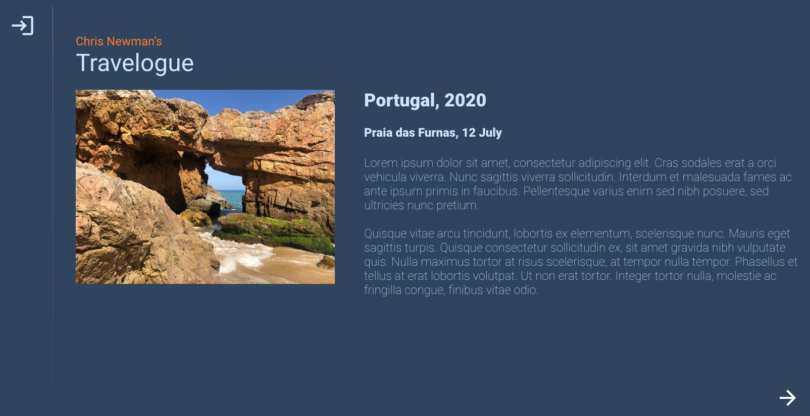 Now, of course, I couldn't just hand you a final project, could I? In this chapter, we scaffolded our travelogue—the rest is up to you. There are a few pieces yet to do to have a fully functional project. After all, we haven't fully adhered to our visual comps, have we? Here are some ideas of what kinds of functionalities to implement in order to complete the project: