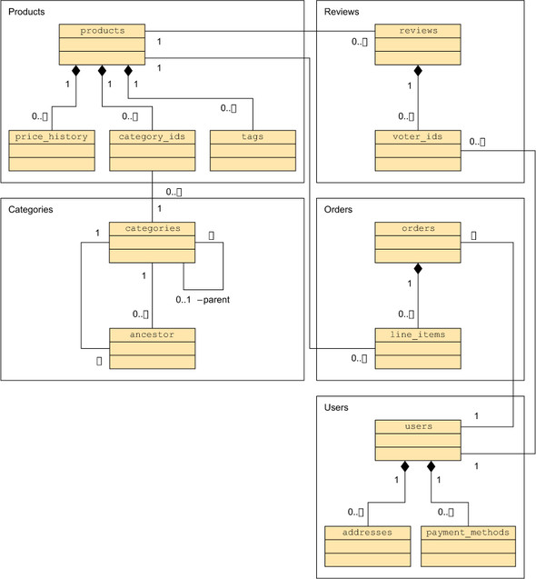 Figure 6.3. Data model summarizing e-commerce collections and relationships