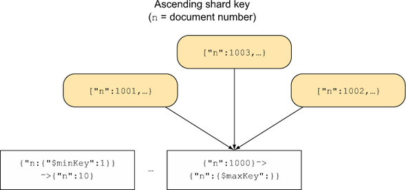 Figure 12.6. The ascending shard key causing all writes to go to one chunk.