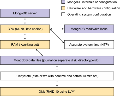 Figure 13.2. A simplified visualization of how MongoDB depends on the operating system and hardware