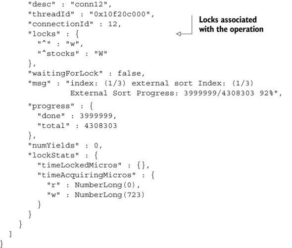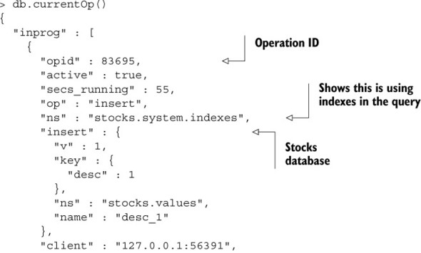 Listing 8.1. Checking the index build process with the shell currentOP() method