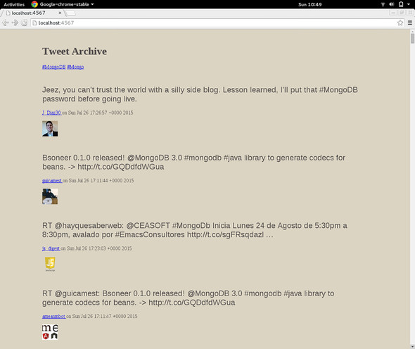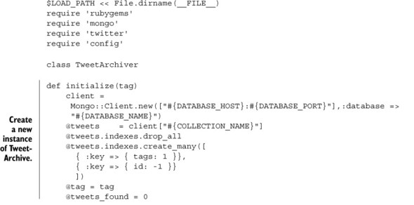 Listing 3.1. archiver.rb—A class for fetching Tweets and archiving them in MongoDB