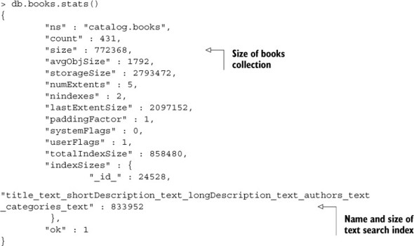 Listing 9.2. books collection statistics showing space use and index name