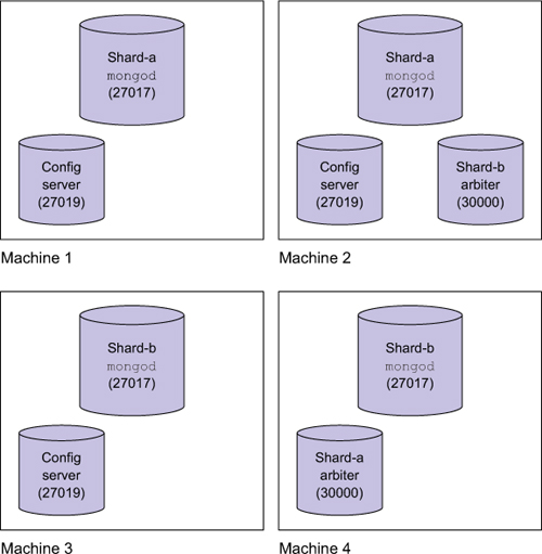 Figure 12.9. A two-shard cluster deployed across four machines