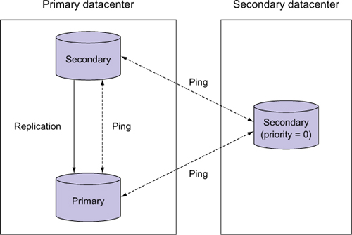 Figure 11.2. A three-node replica set with members in two datacenters