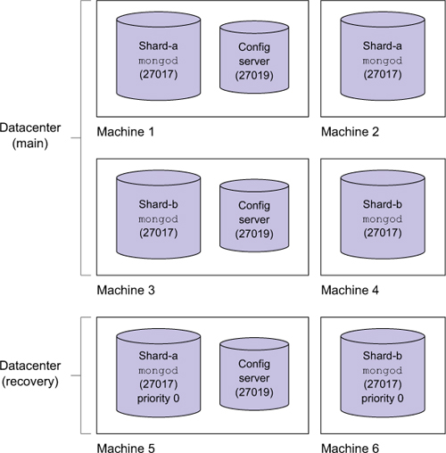 Figure 12.10. A two-shard cluster deployed across six machines and two datacenters