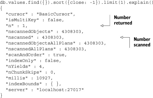 Listing 2.1. Typical explain("executionStats") output for an unindexed query