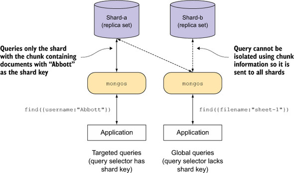 Figure 12.5. Targeted and global queries against a shard cluster