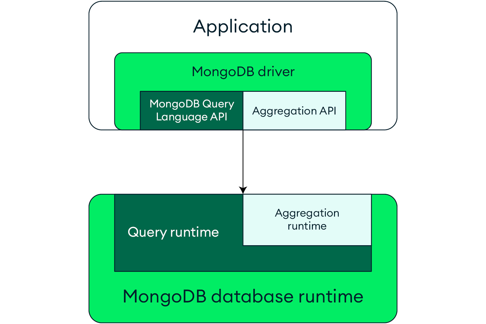 Each driver provides APIs to enable an application to use both the MongoDB Query Language (MQL) and the aggregation framework. In the database, the aggregation runtime reuses the query runtime to efficiently execute the query part of an aggregation workload that typically appears at the start of an aggregation pipeline.