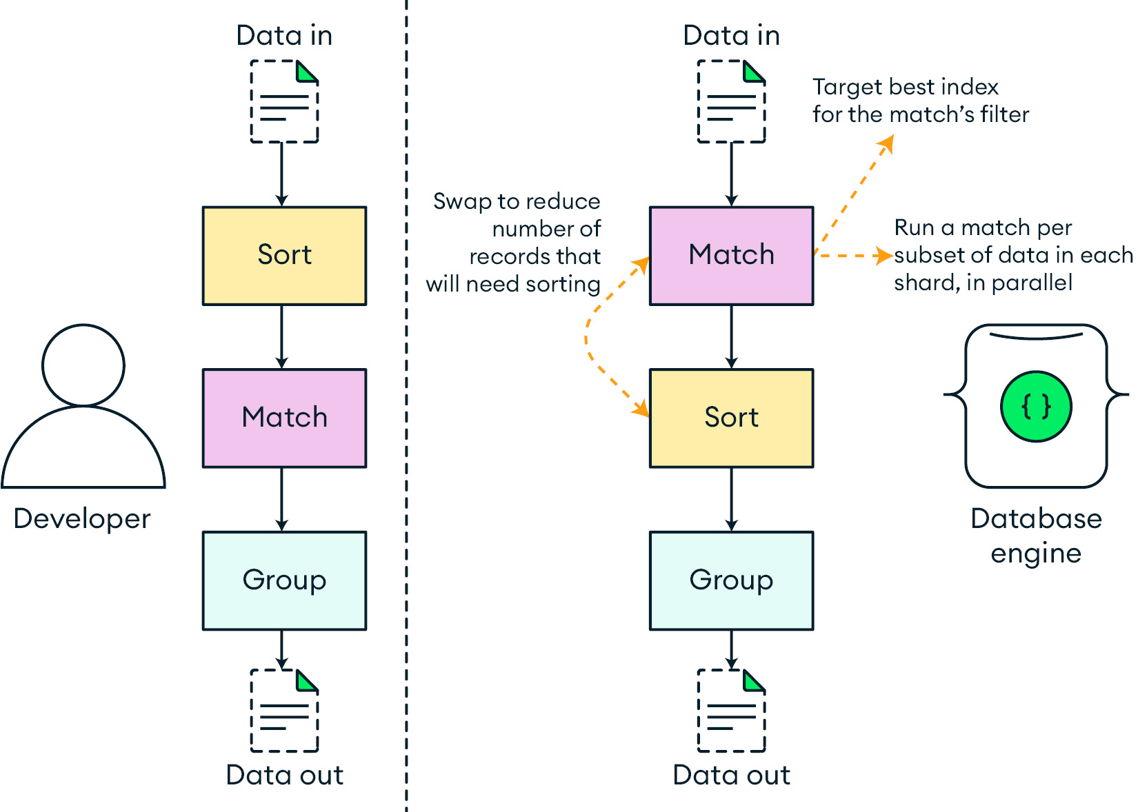 Developers needed a new way to aggregate data natively on the server that was both intuitive and efficient. We called what we came up with the aggregation framework. Since the stages of data processing in the aggregation framework were organized as a pipeline (familiarly evoking processing files on the Unix command line, for those of us who did such things a lot), we also referred to it as the aggregation pipeline. Very quickly, agg became my favorite feature of MongoDB because of its flexibility, power, and ease of debugging.