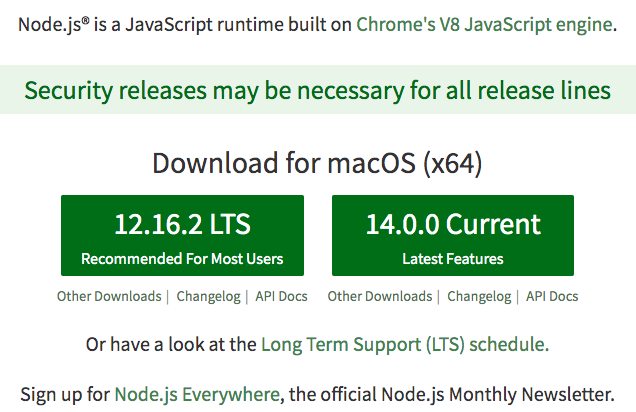Because Node.js is on top of Chrome's V8 engine, the platform is able to quickly adopt the latest advances in the JavaScript language. The Node.js core team works closely with the V8 team, letting it quickly adopt new JavaScript language features as they are implemented in V8. Node.js 14.x is the current release and this book is written for that release.