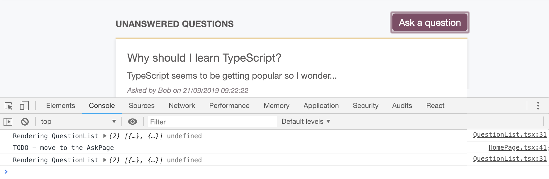 Chapter 3, Getting Started with React and TypeScript, covers the fundamentals of React, such as JSX, props, state, and events. The chapter also covers how to create strongly typed components with TypeScript.