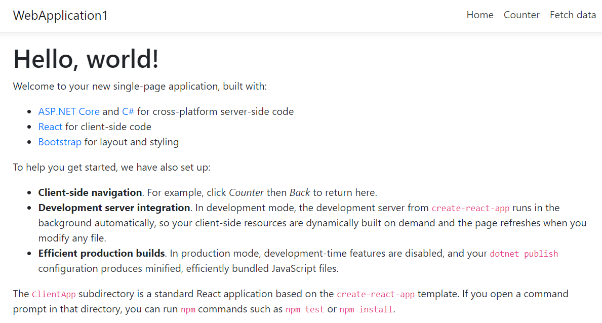 In this first chapter, we'll start by learning about the single-page application (SPA) architecture. Then, we'll create an ASP.NET Core and React app using the standard template in Visual Studio. We will use this to review and understand the critical parts of a React and ASP.NET Core app. We'll learn where the entry points of both the ASP.NET Core and React apps are and how they integrate with each other. We'll also learn how Visual Studio runs both the frontend and backend together in development mode, as well as how it packages them up, ready for production. By the end of this chapter, we'll have gained fundamental knowledge so that we can start building an app that uses both of these awesome technologies, and that we'll gradually build throughout this book.
