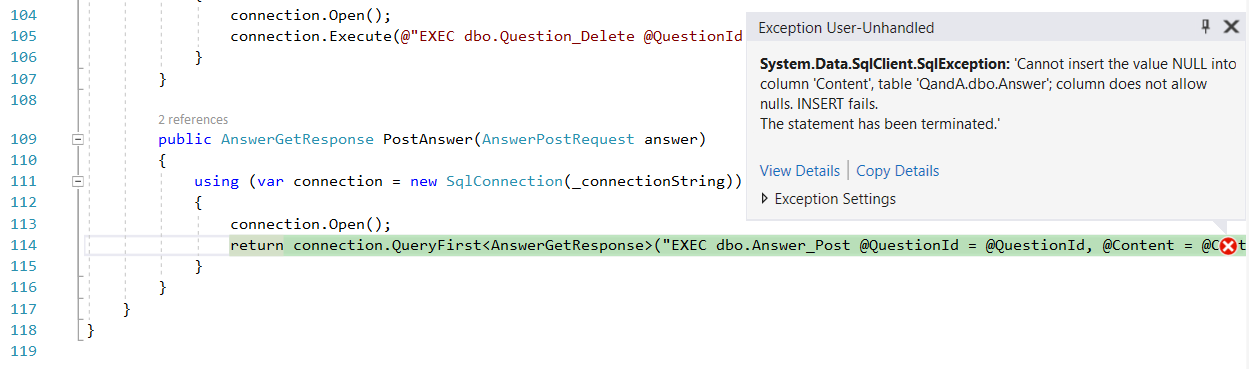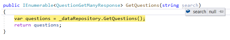 The query expects a parameter called Search but we have passed it a parameter called Criteria. So, Dapper won't be able to map the SQL parameter.