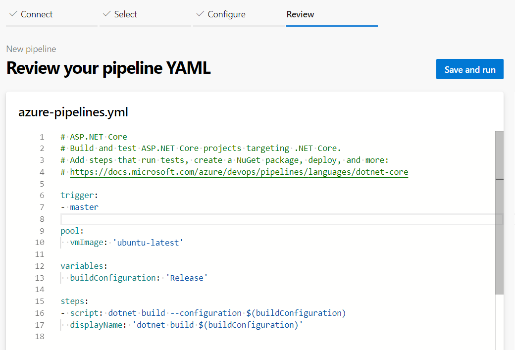 The azure-pipelines.yml file is committed and pushed to our source code repository and the build is triggered when any code is pushed to the repository.