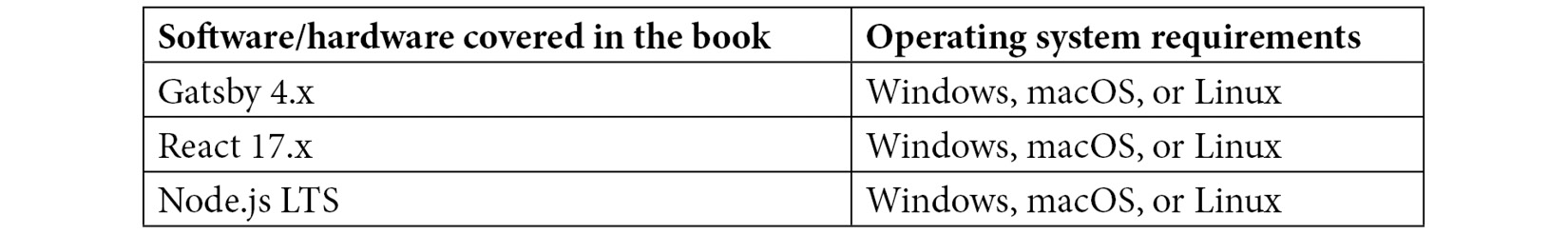 In this book, we will take your existing React knowledge and supplement it with Gatsby.js (which we will refer to as Gatsby from now on) to create performant and accessible static sites. I hope to give you the tools you need to create better websites using Gatsby and get you to join the static site revolution. So, happy hacking!