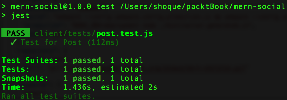 In the code that we added to the post.test.js file, the dummy auth object and the post object refer to the same user; therefore, running this test in the command line will prompt Jest to generate a snapshot that will contain the delete option and also pass the test.
