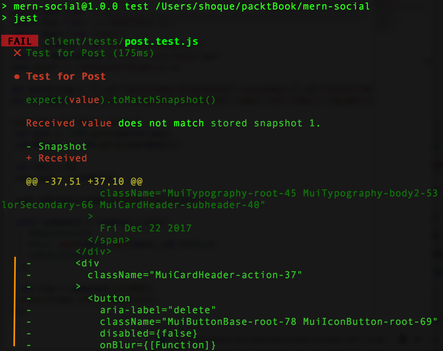 We can now check whether the test actually fails when the component is rendered with an authenticated user that is not the creator of the post. To perform this check, we will update the dummy data objects by changing the user._id, so it does not match the postedBy value, and then run the test again. This will give us a failed test, as the current rendering will no longer have a delete button that is present in the recorded snapshot.