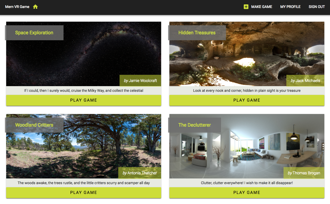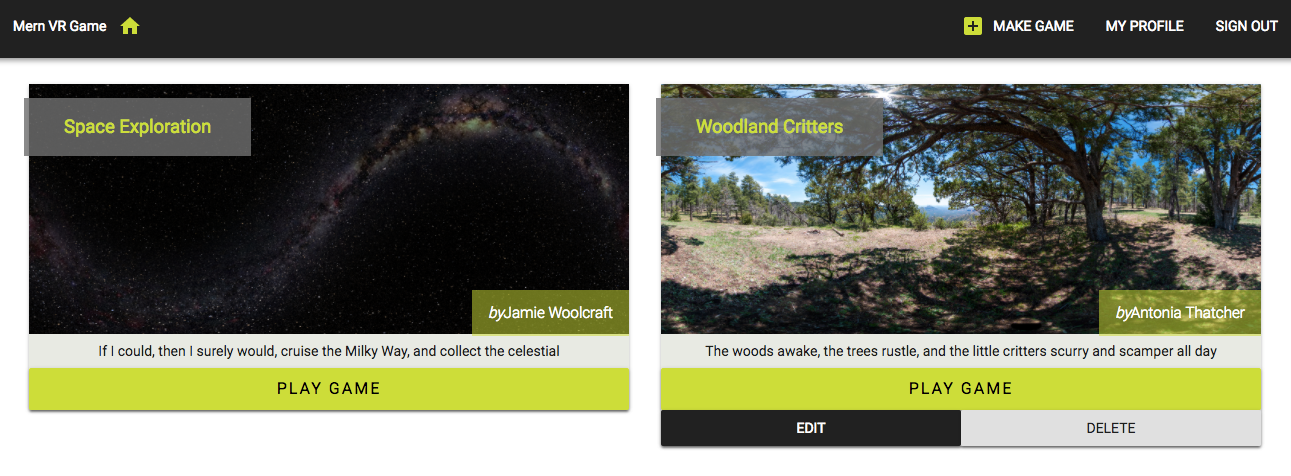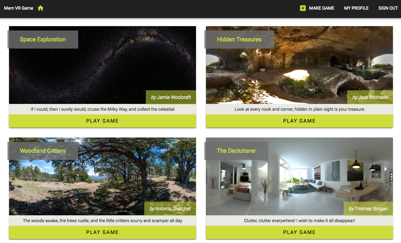 Chapter 14, Making the VR Game Dynamic Using MERN, is where you will build a dynamic VR game application by extending the MERN skeleton application and integrating React 360. We will implement a game data model that allows users to create their own VR games and incorporate the dynamic game data with the game developed using React 360.