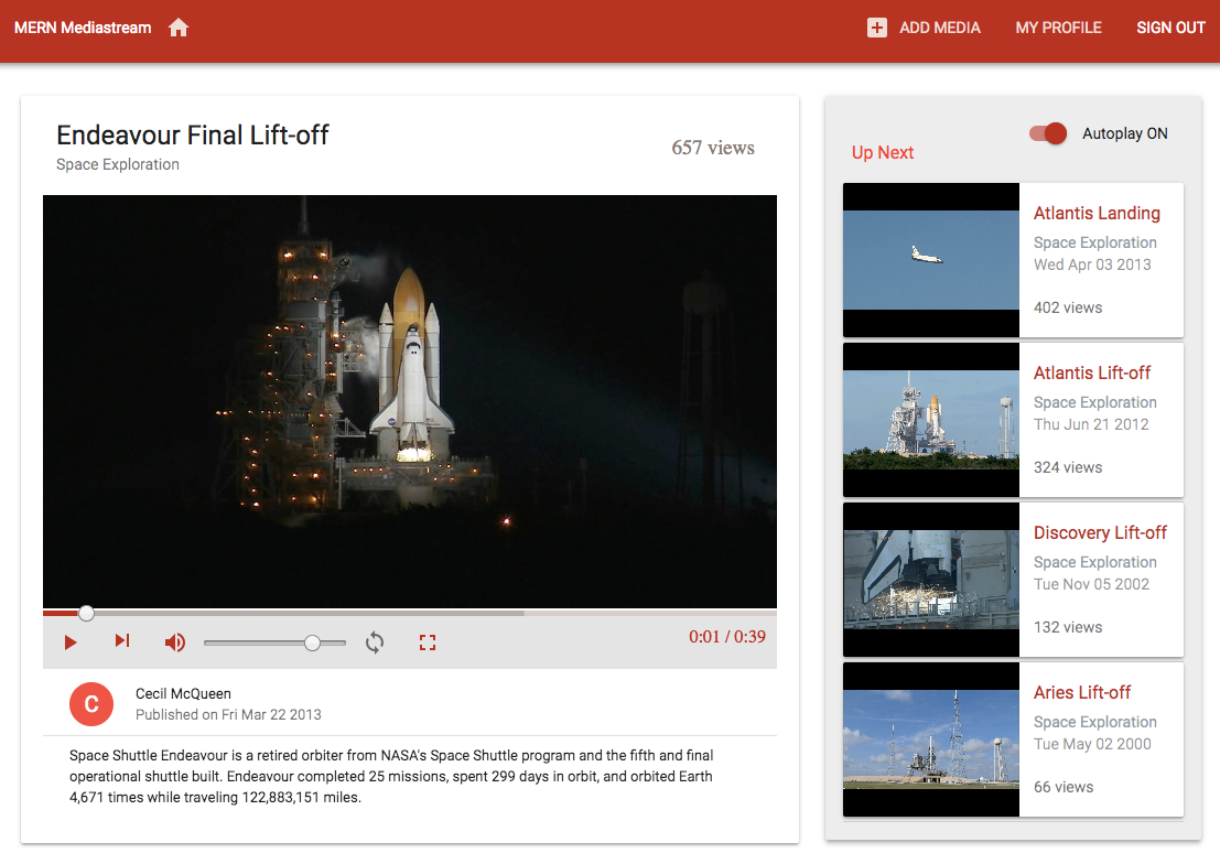 Chapter 11, Building a Media Streaming Application, focuses on extending the MERN skeleton application to build a media uploading and streaming application using MongoDB GridFS. We will start by building a basic media streaming application, allowing registered users to upload video files that will be stored on MongoDB and streamed back so that viewers can play each video in a simple React media player.