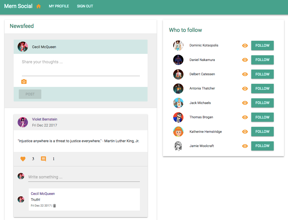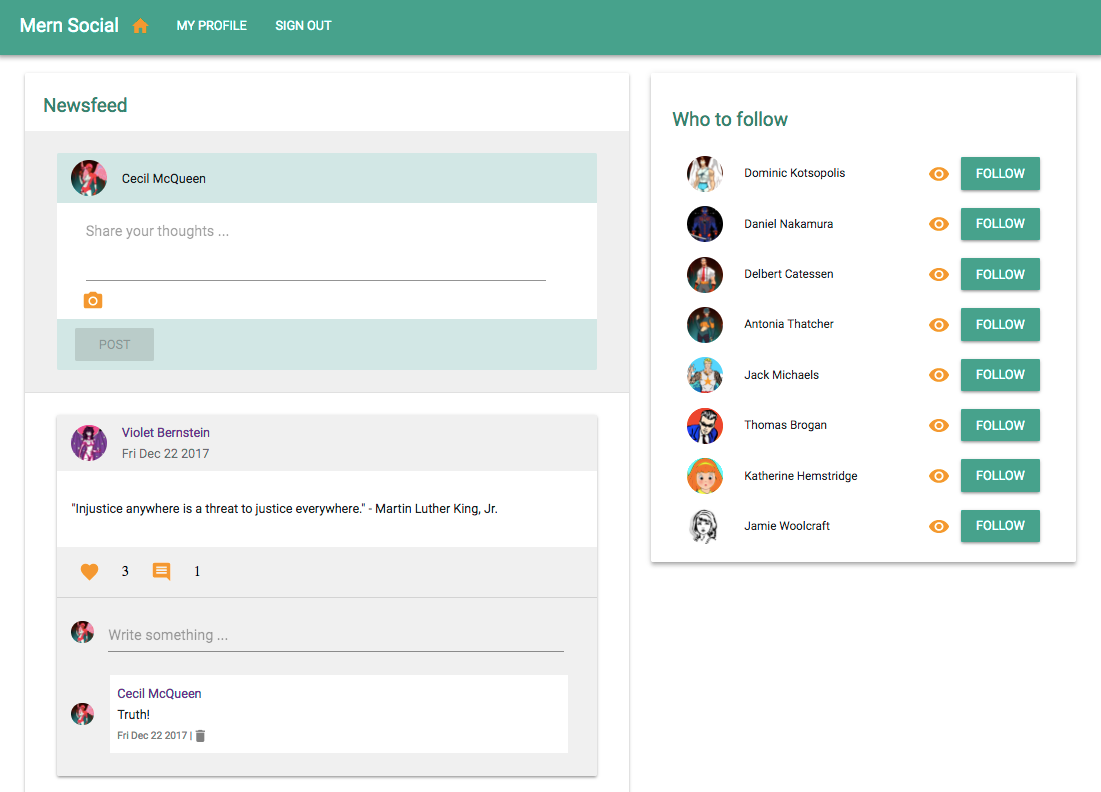 Chapter 5, Growing the Skeleton into a Social Media Application, builds a social media application by extending the skeleton application. We will explore the capabilities of the MERN stack by implementing social media features, such as post sharing, liking, commenting, following friends, and an aggregated newsfeed.