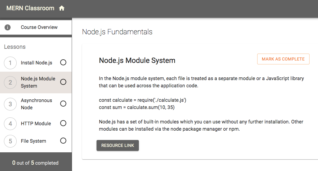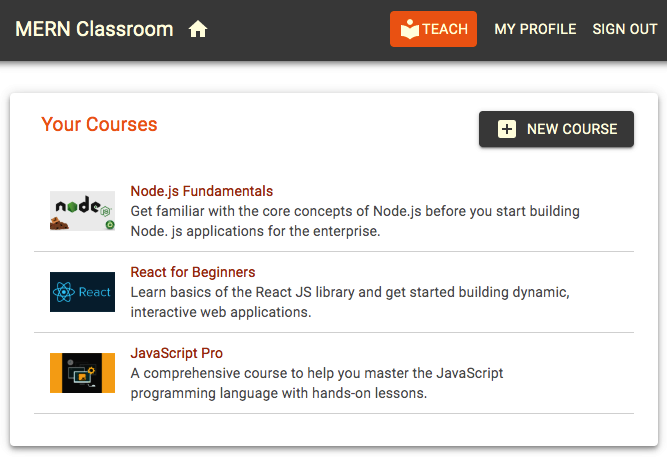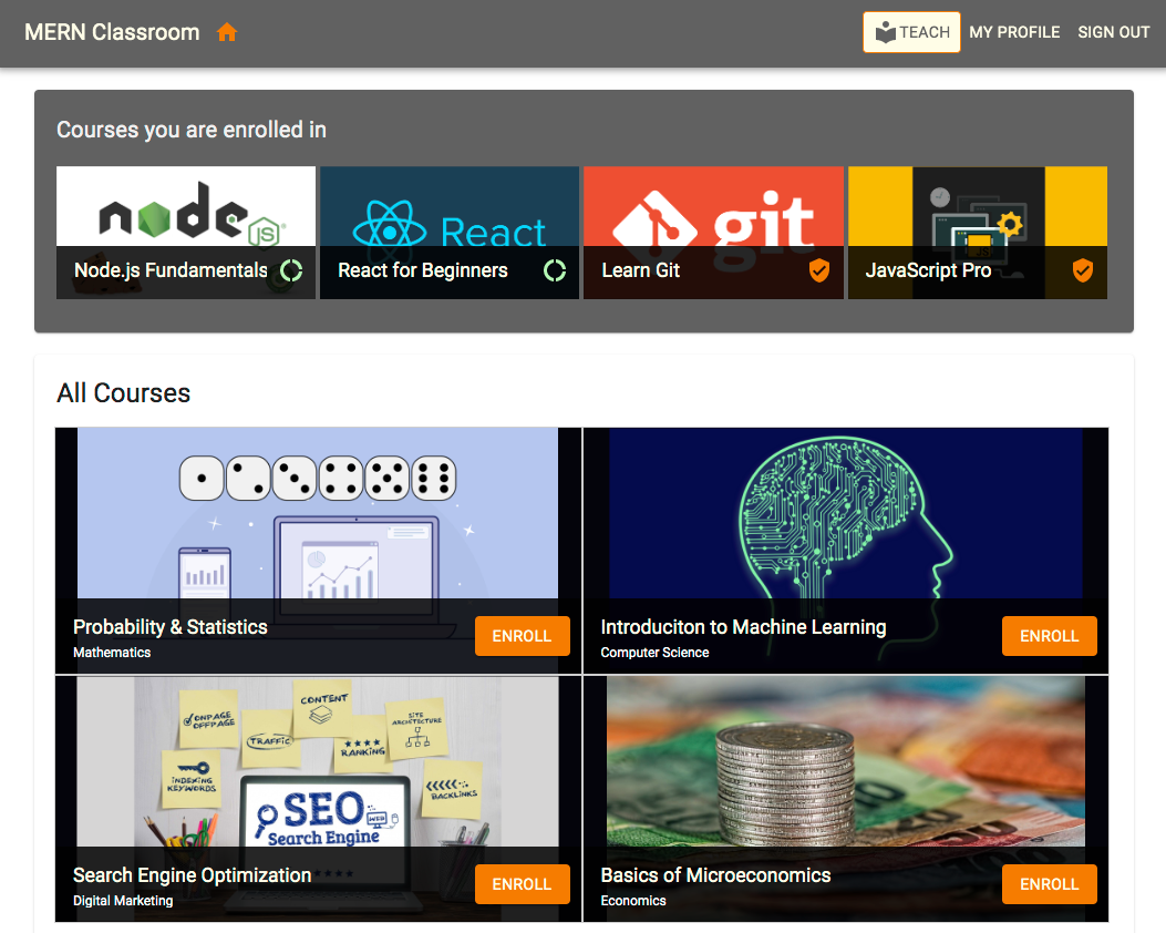 Chapter 6, Building a Web-Based Classroom Application, focuses on building a simple online classroom application by extending the MERN stack skeleton application. This classroom application will support multiple user roles, the addition of course content and lessons, student enrollments, progress tracking, and course enrollment statistics.