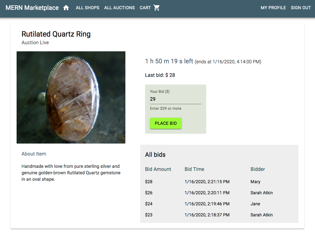 Chapter 9, Adding Real-Time Bidding Capabilities to the Marketplace, focuses on teaching you how to use the MERN stack technologies, along with Socket.IO, to easily integrate real-time behavior in a full-stack application. We will do this by incorporating an auctioning feature with real-time bidding capabilities in the MERN marketplace application.