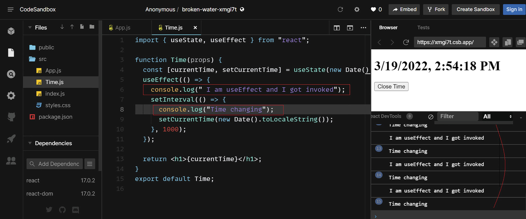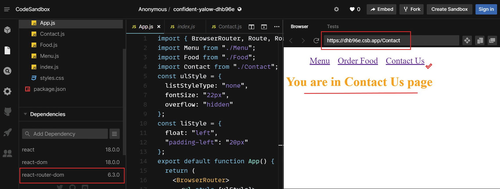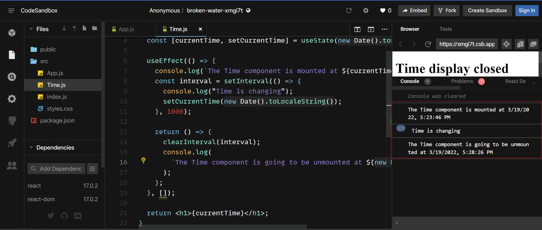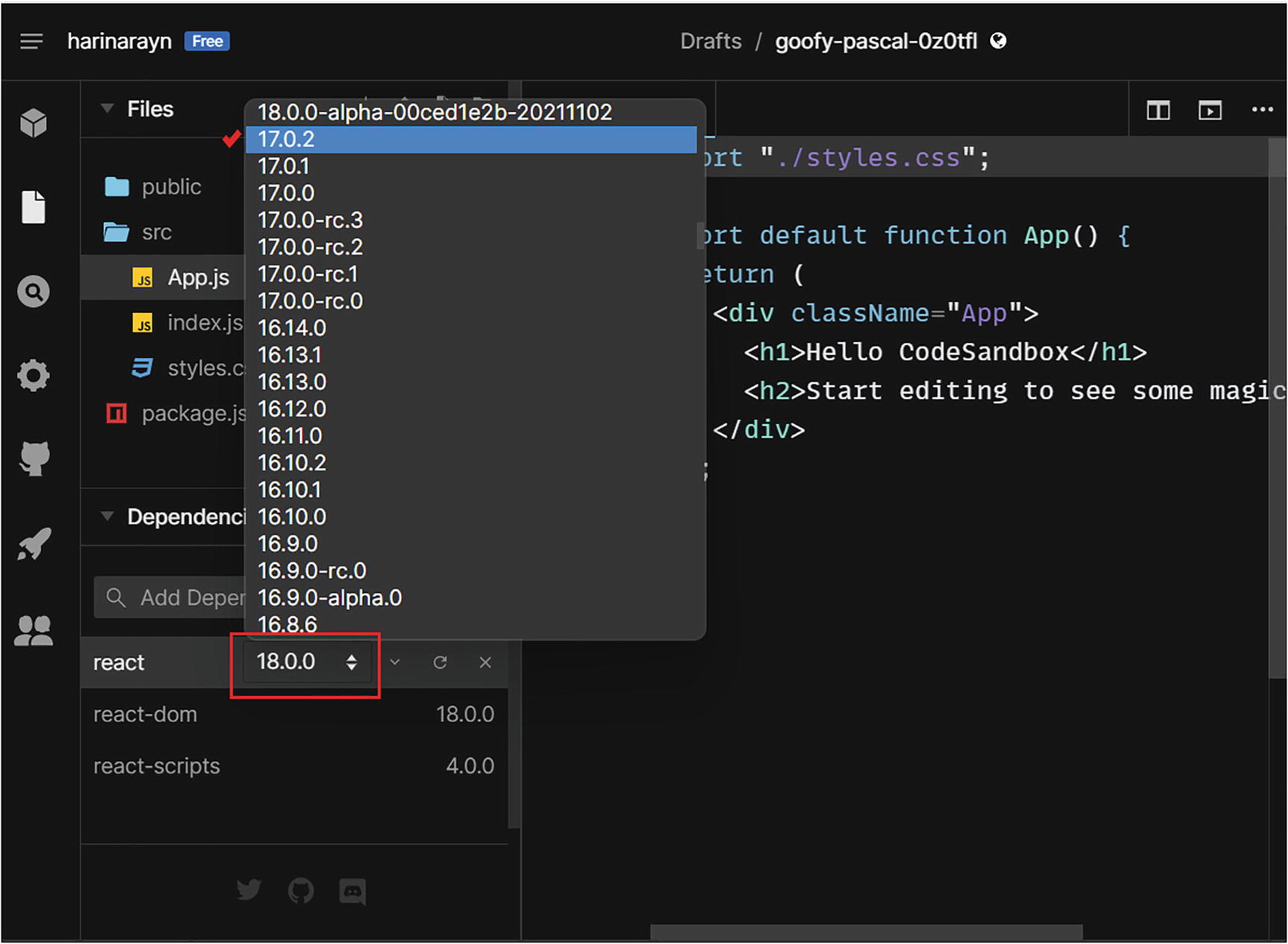 Set up a new sandbox in CodeSandbox. First, let us downgrade to React 17, as described in the first section. Update react and react-dom packages to 17.0.2 and copy Listing 10-1 to index.js because we need the old Root API code for React 17.