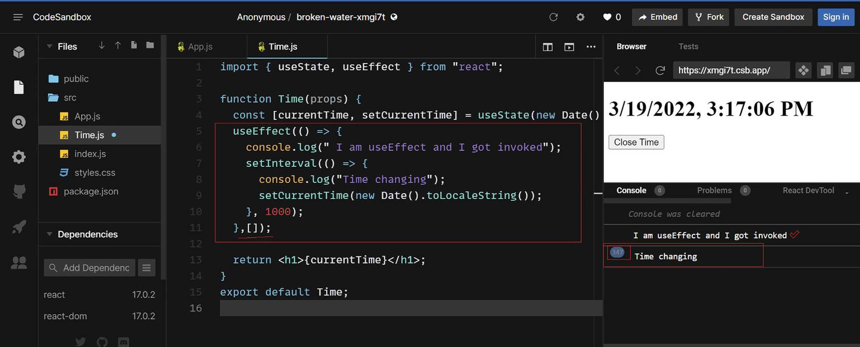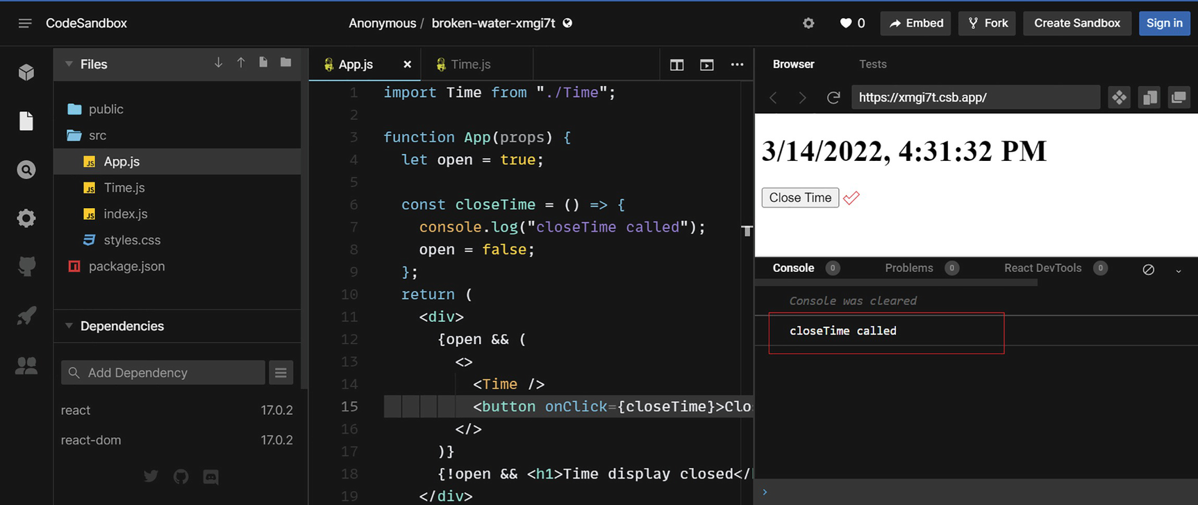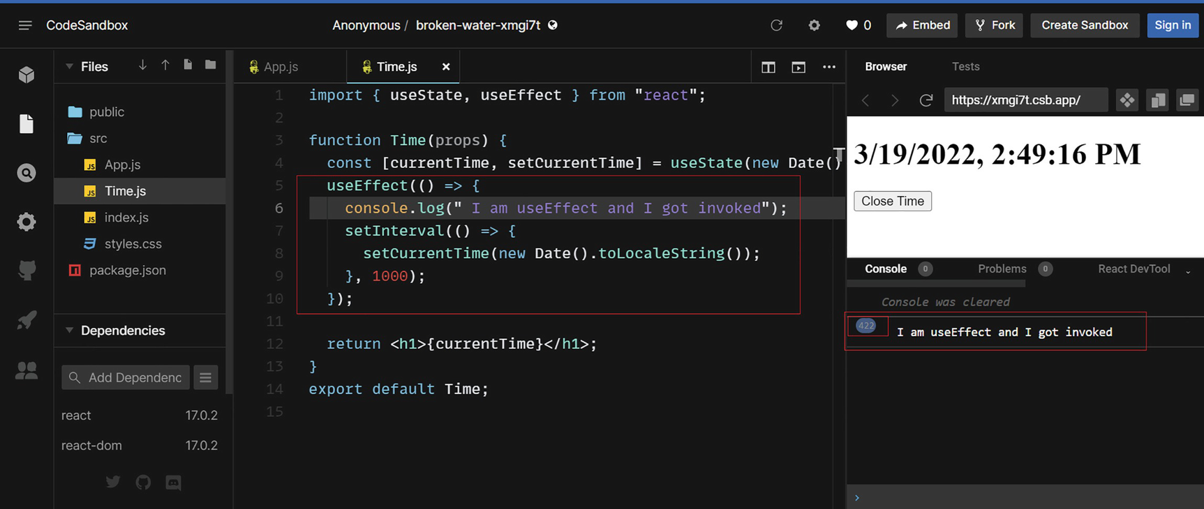 Set up a new sandbox in CodeSandbox. First, let us downgrade to React 17, as described in the first section. Update react and react-dom packages to 17.0.2 and copy Listing 10-1 to index.js because we need the old Root API code for React 17.