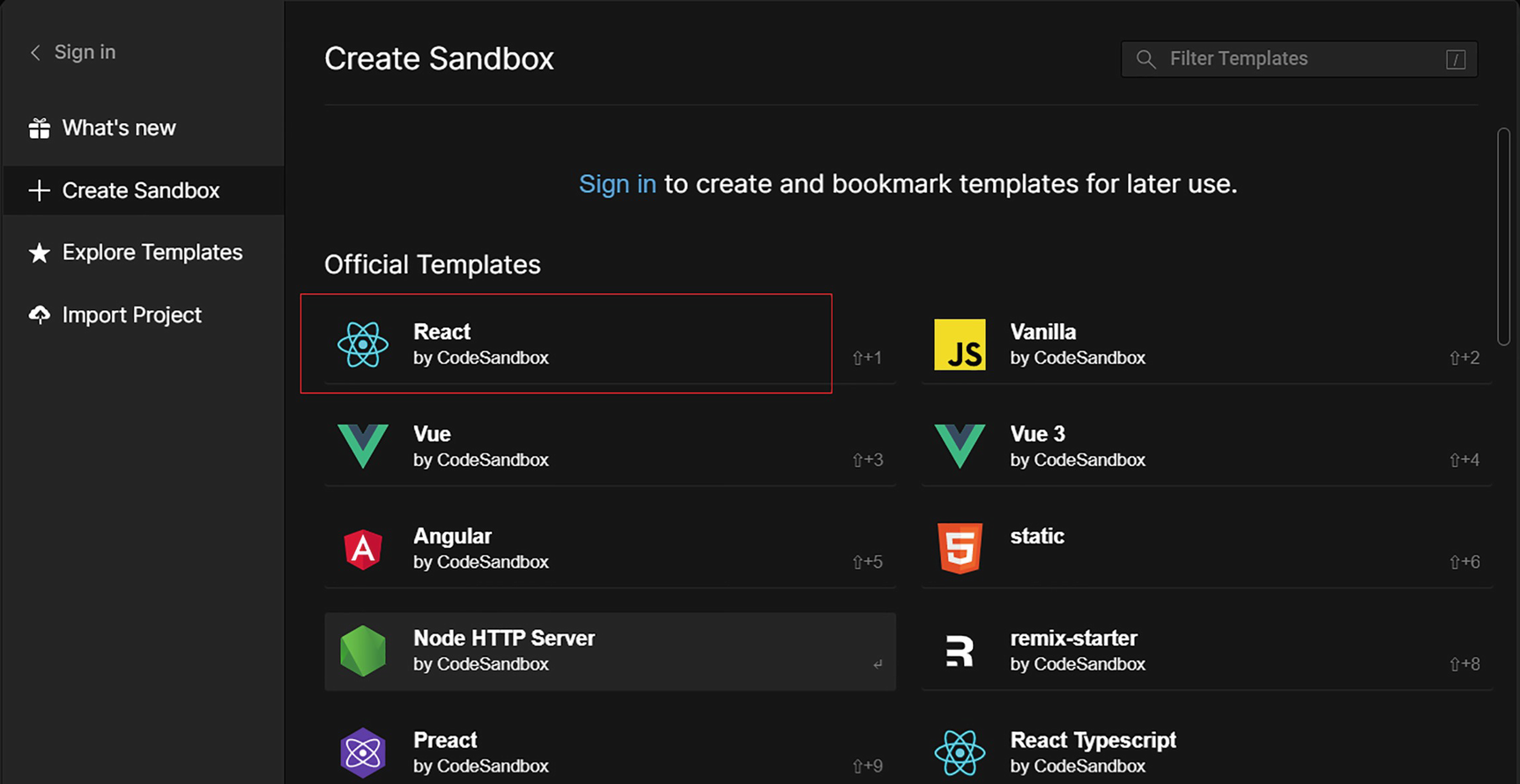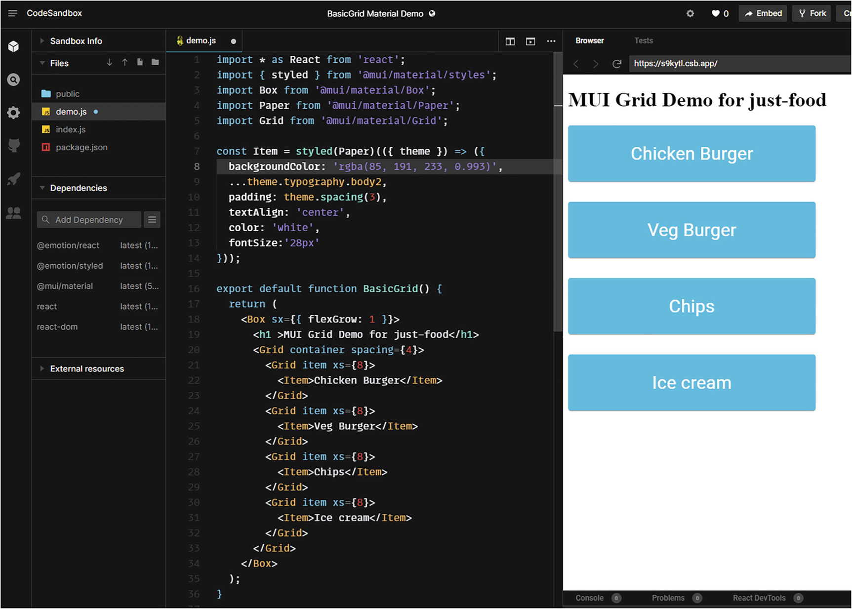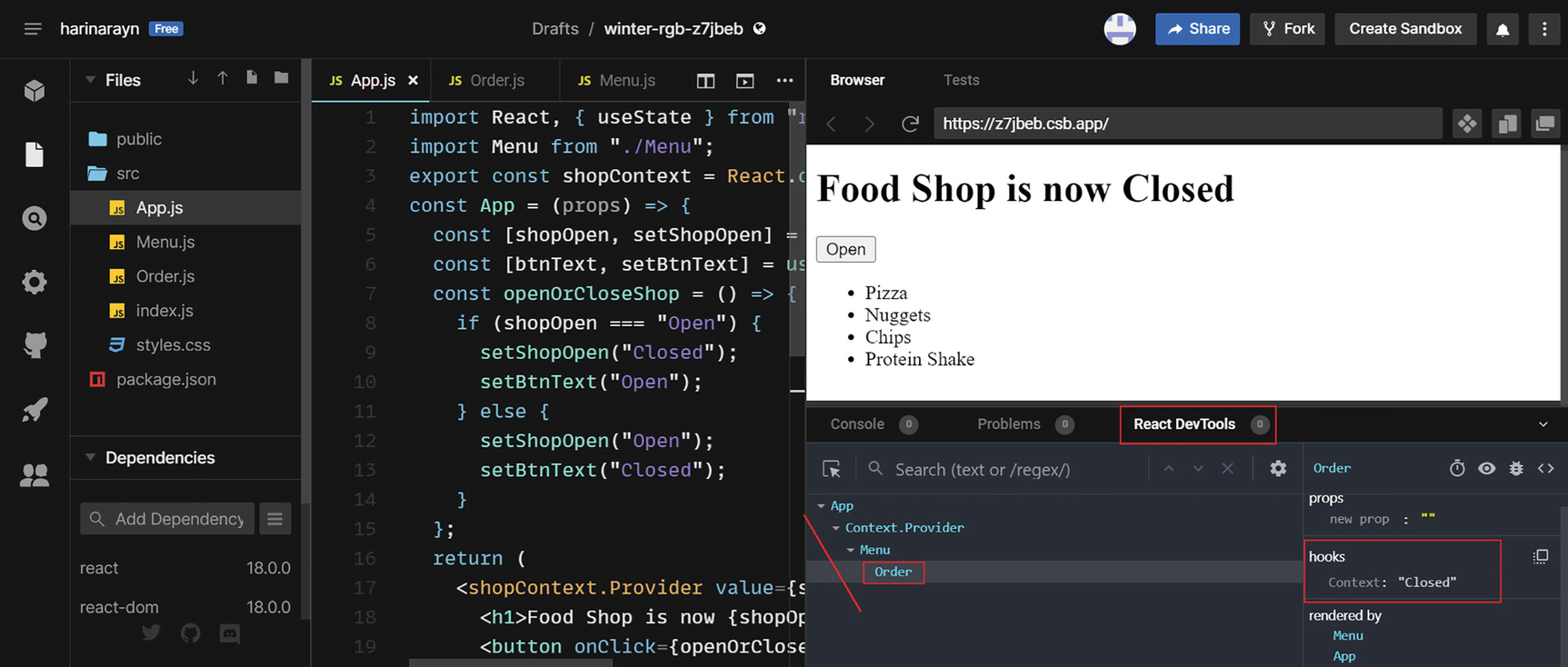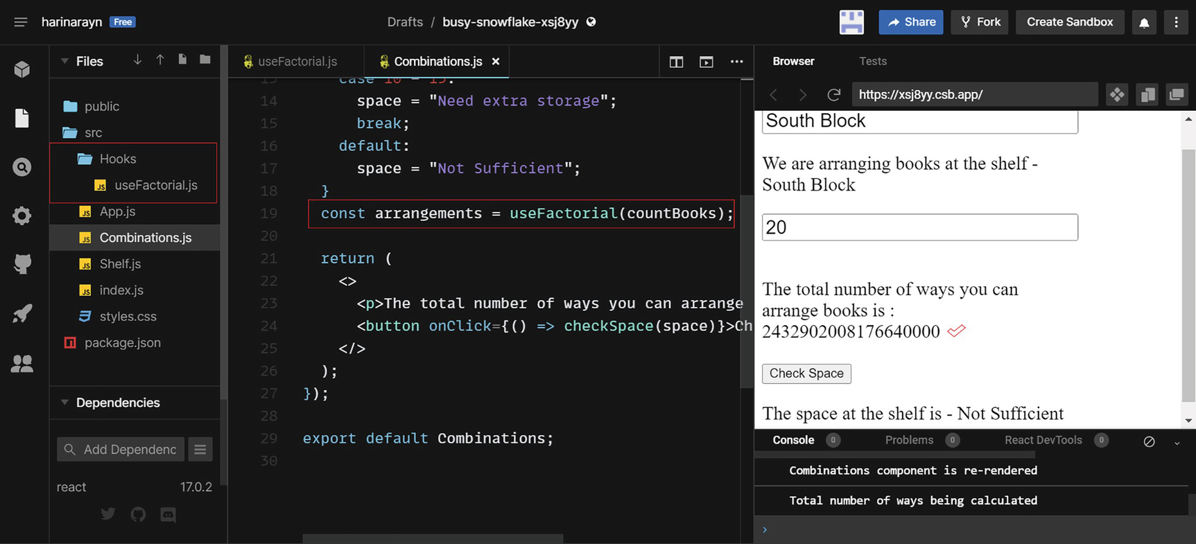 Set up a new sandbox in CodeSandbox. First, let us downgrade to React 17, as described in the first section. Update react and react-dom packages to 17.0.2 and copy Listing 10-1 to index.js because we need the old Root API code for React 17.