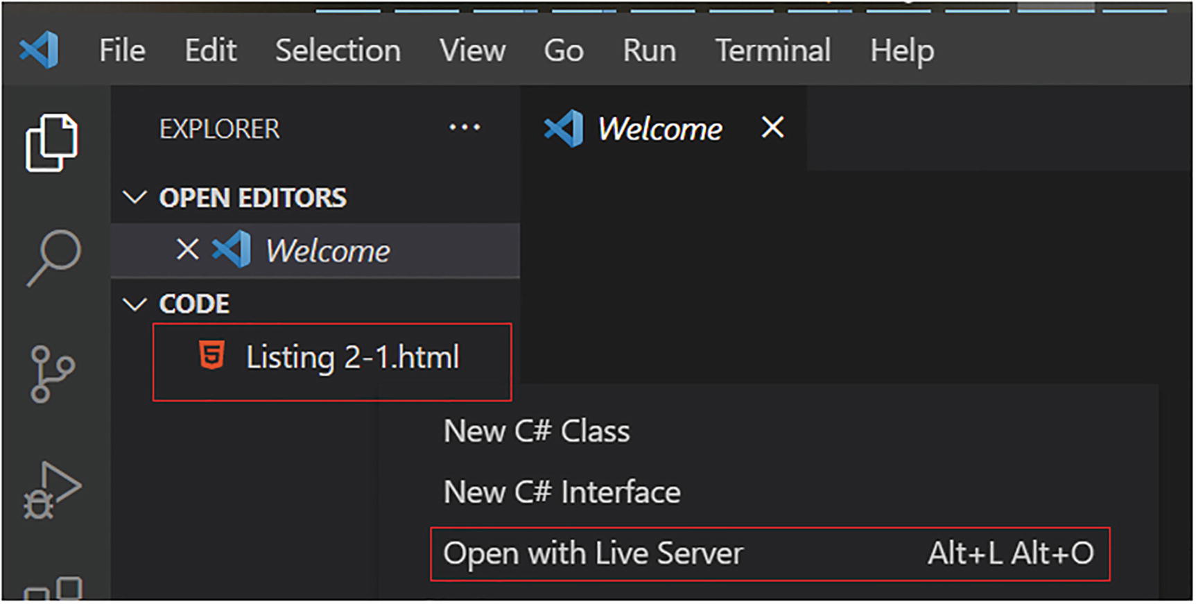 Once you saved the file, click the “Open Folder” button on the left-hand side of Explorer. Open the folder in which you saved the preceding HTML file. A prompt will open, and it will ask you, “Do you trust the authors of the file in this folder?” Click the checkbox to trust all files and then click “Yes, I trust the authors.” Now, you can view all the files of the folder on the left-hand side of Explorer.