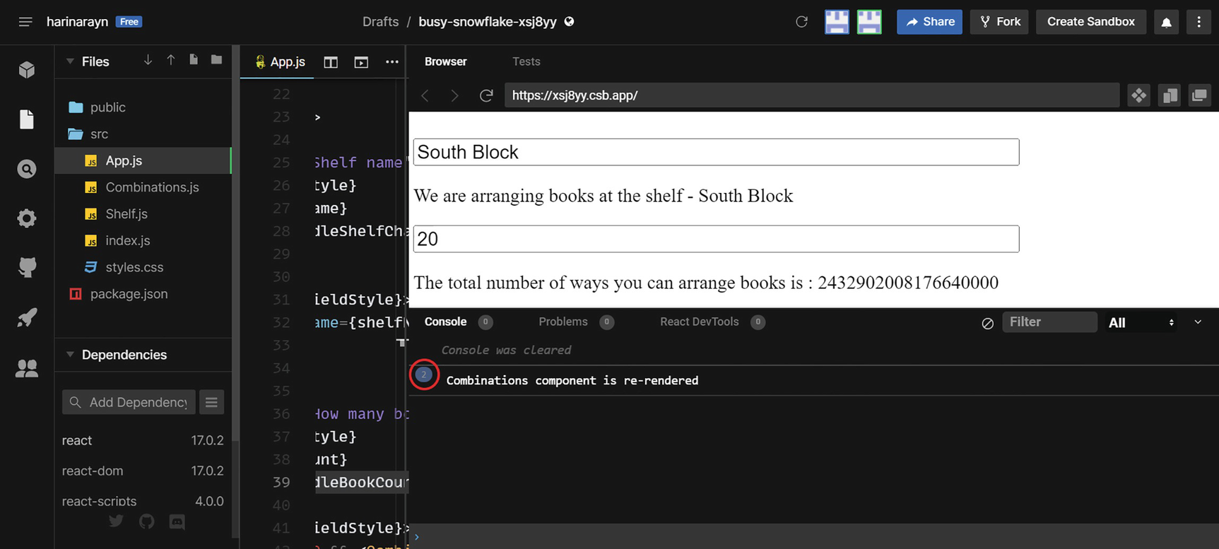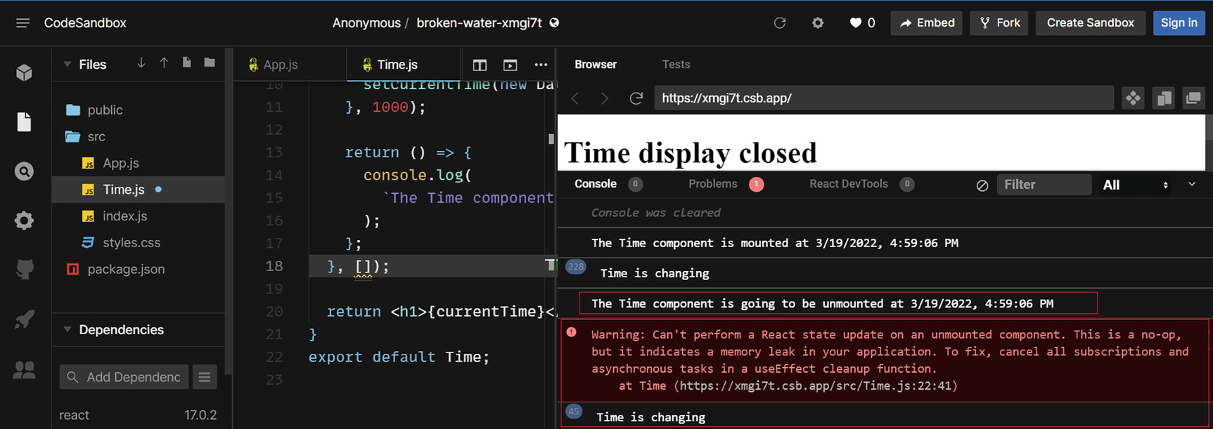 Hit the refresh icon on the CodeSandbox browser. The warning has disappeared now. Compare Listings 10-1 and 10-2. You can see that the new Root API uses ReactDOM.createRoot as opposed to the ReactDOM.render in the old API. Previously, it was necessary to pass the root element to the render method in the old API, but no longer. The new API provides access to React 18’s concurrent features.