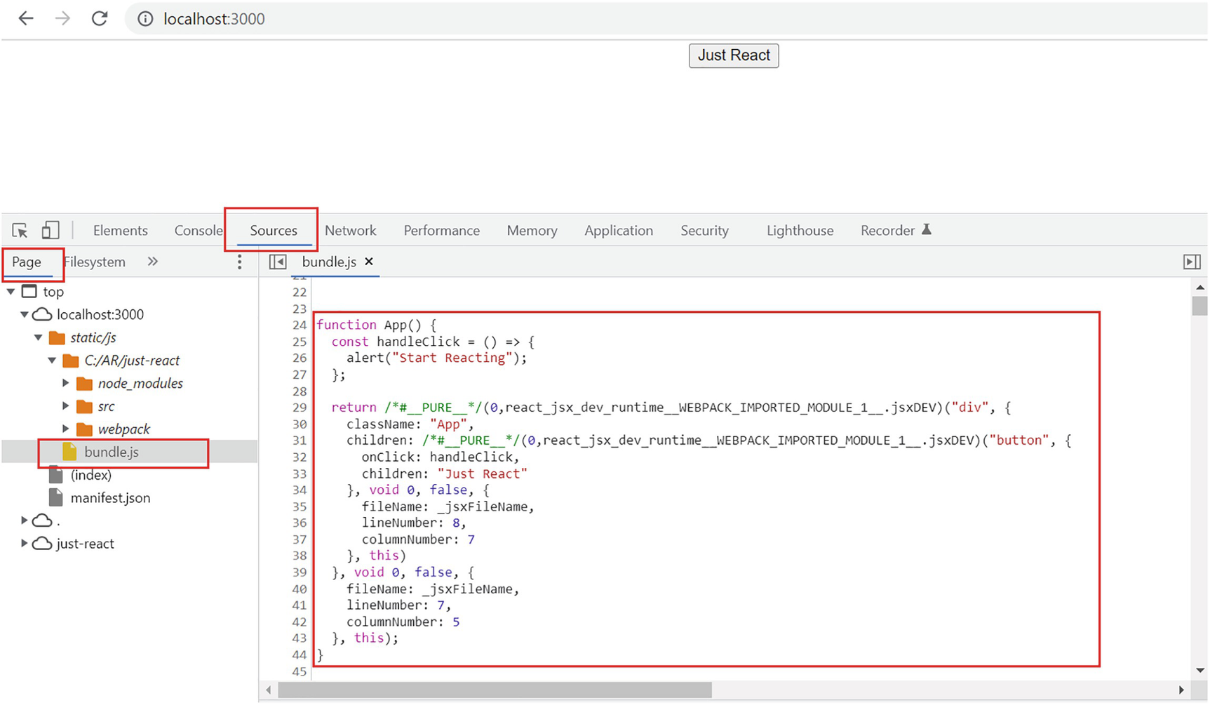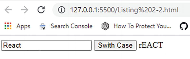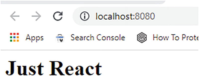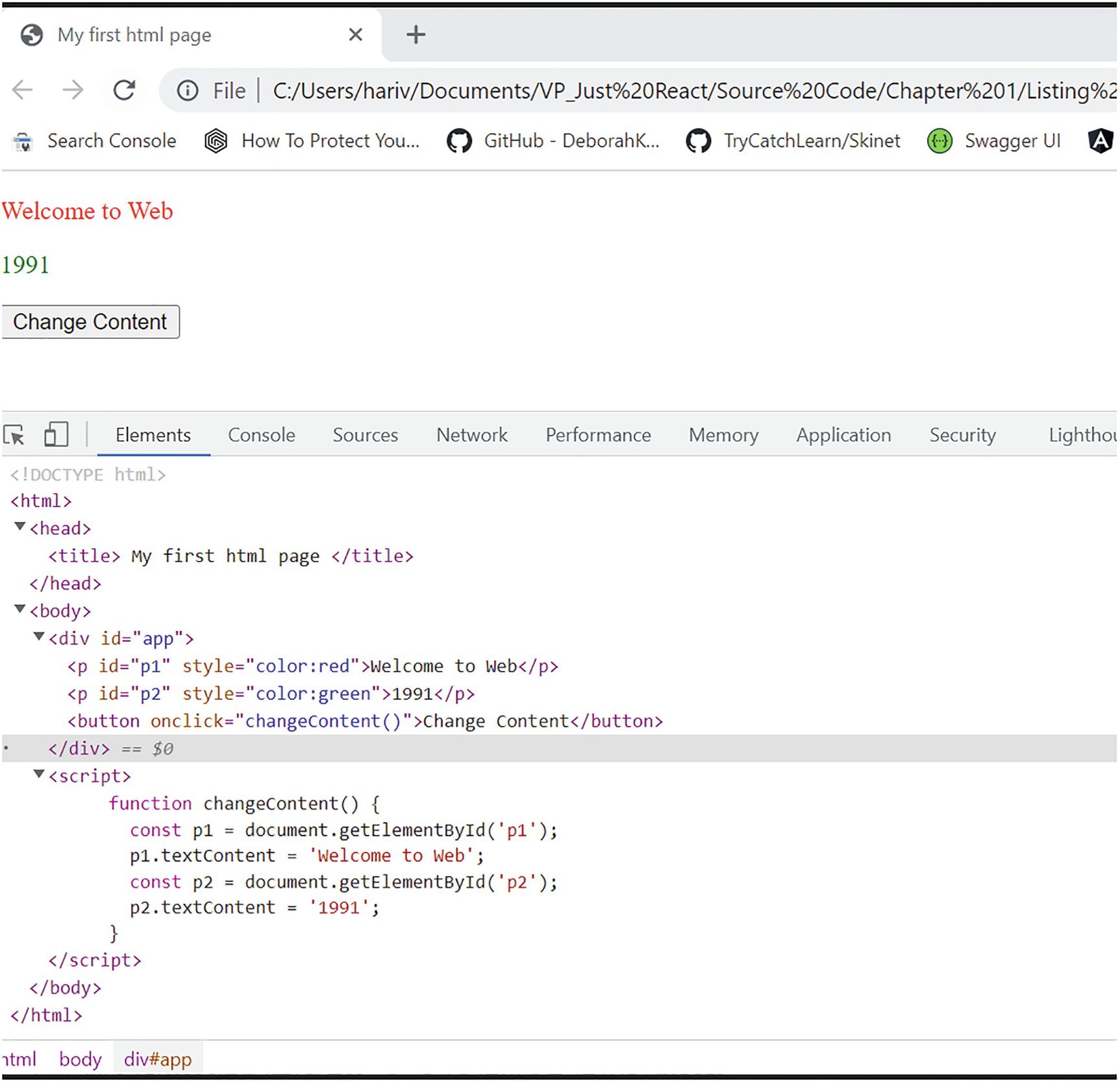 Put the code in Listing 1-1 into a notepad and save as Listing1-1.html. Go to the saved location, right-click, and open it in the browser. You can see the page displays the text Just React in red and the text 2022 in green. Whenever you open an HTML file saved on your local drive, the browser reads it but does not understand it. Then, how does the content get displayed eventually in the browser?
