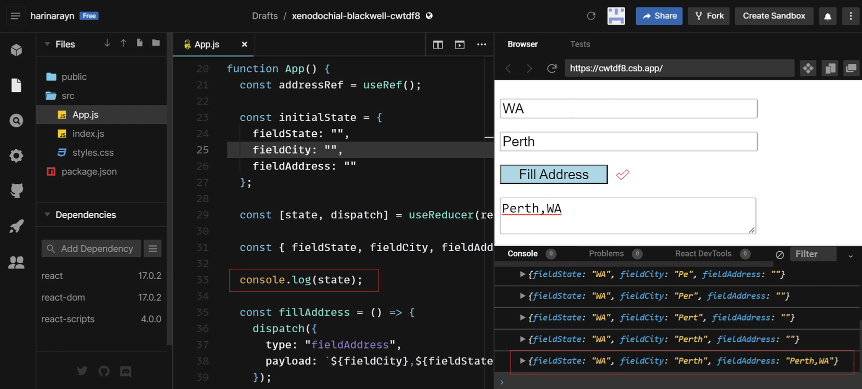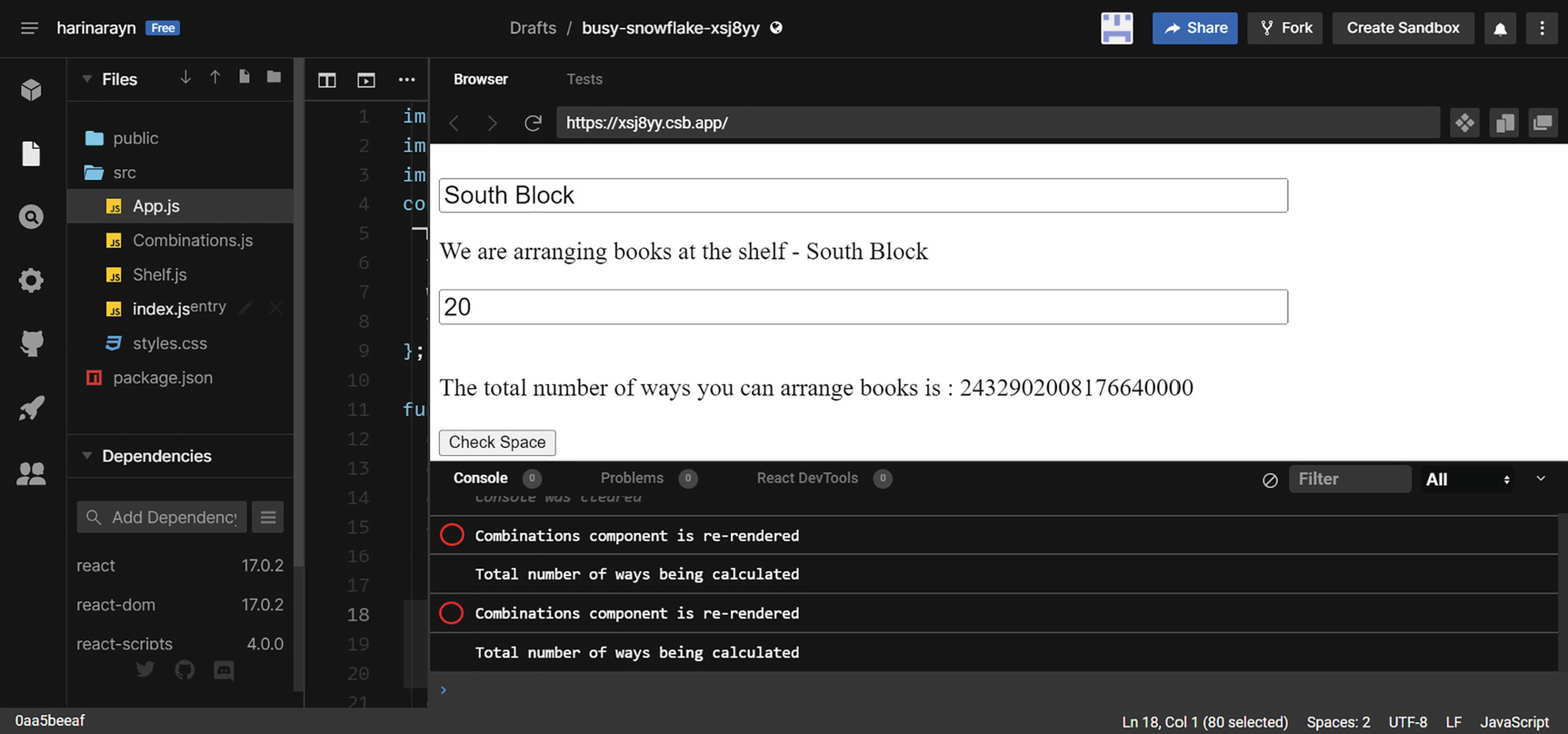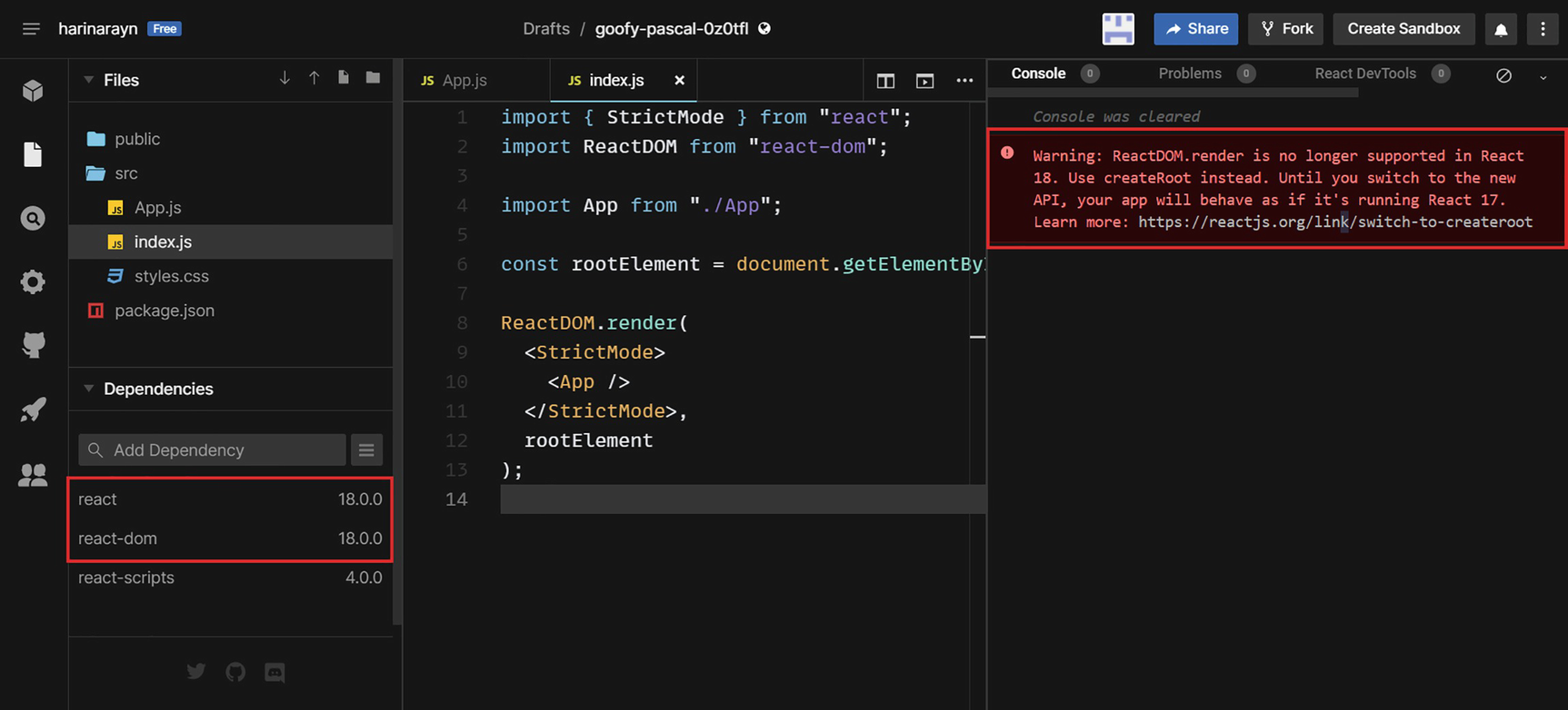As you can see, the app is running with no issues. Now try to upgrade to React 18 by switching back the versions of the dependency packages to 18.0. A warning will appear on the console.