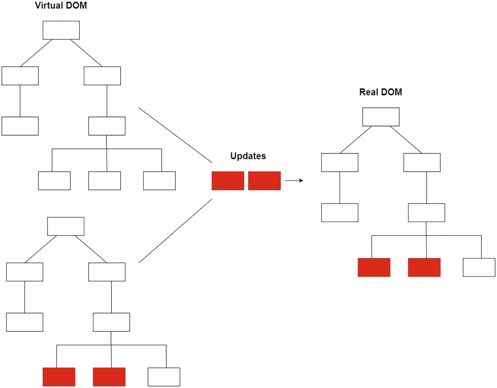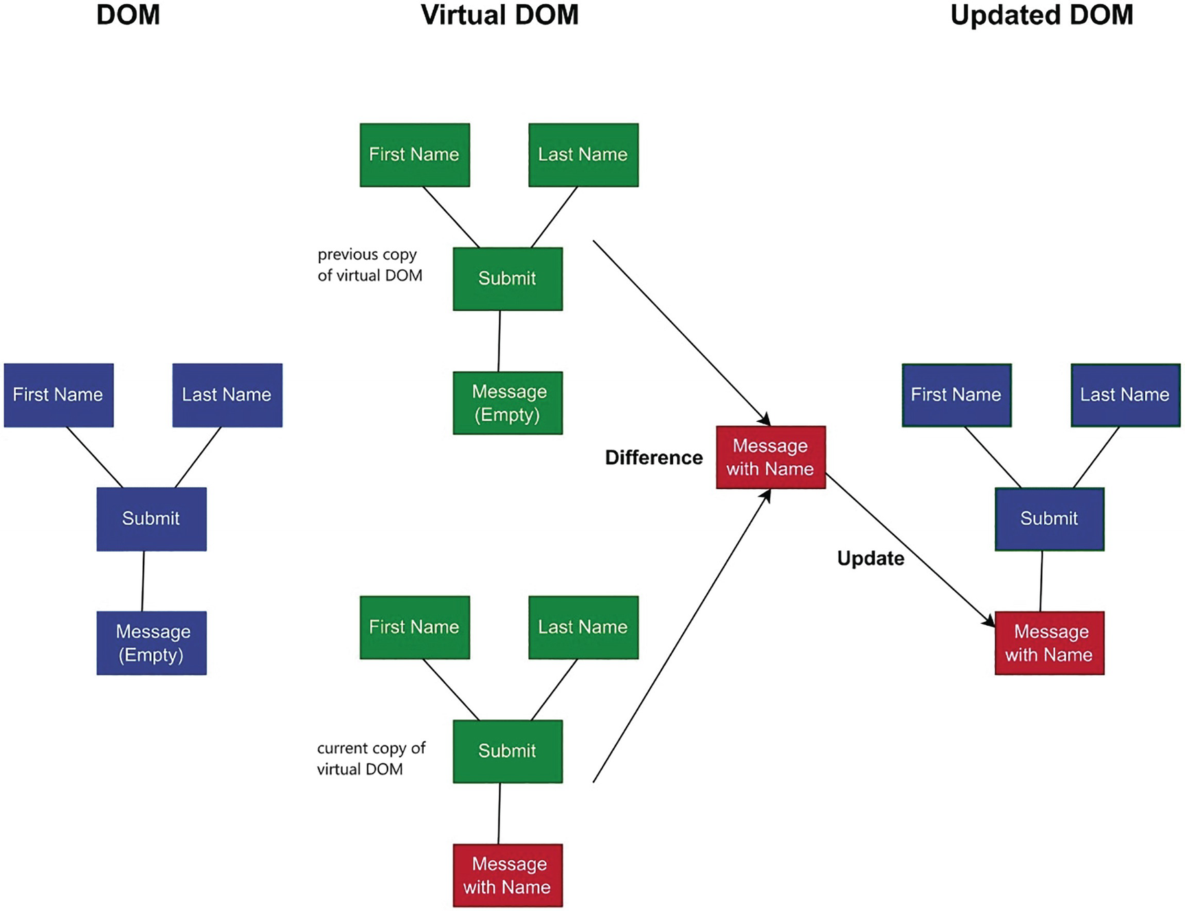 React uses a concept called the Virtual DOM to work a bit differently. It creates two copies of the DOM in memory. When we change the DOM, it changes one copy of the DOM. Then, it compares that copy with the other copy to determine what has changed. This process is called diffing.