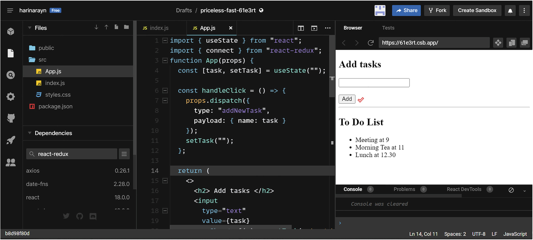 The dispatch function calls the reducer, which updates the state. We defined the reducer function in index.js. As the App component is subscribed to the store updates, the prop tasks gets updated with the new state, thus updating the to-do menu list.