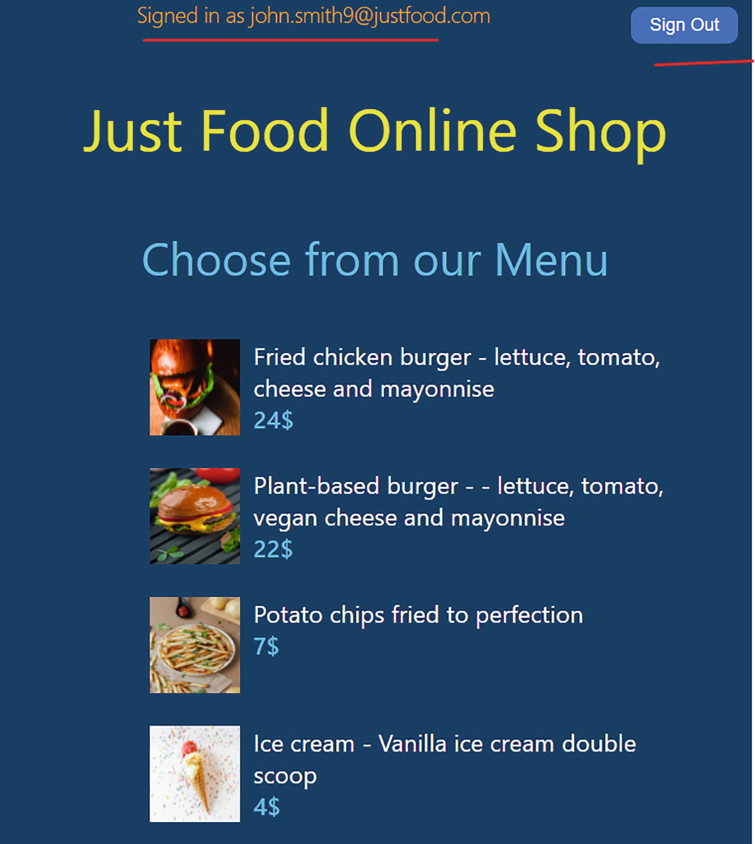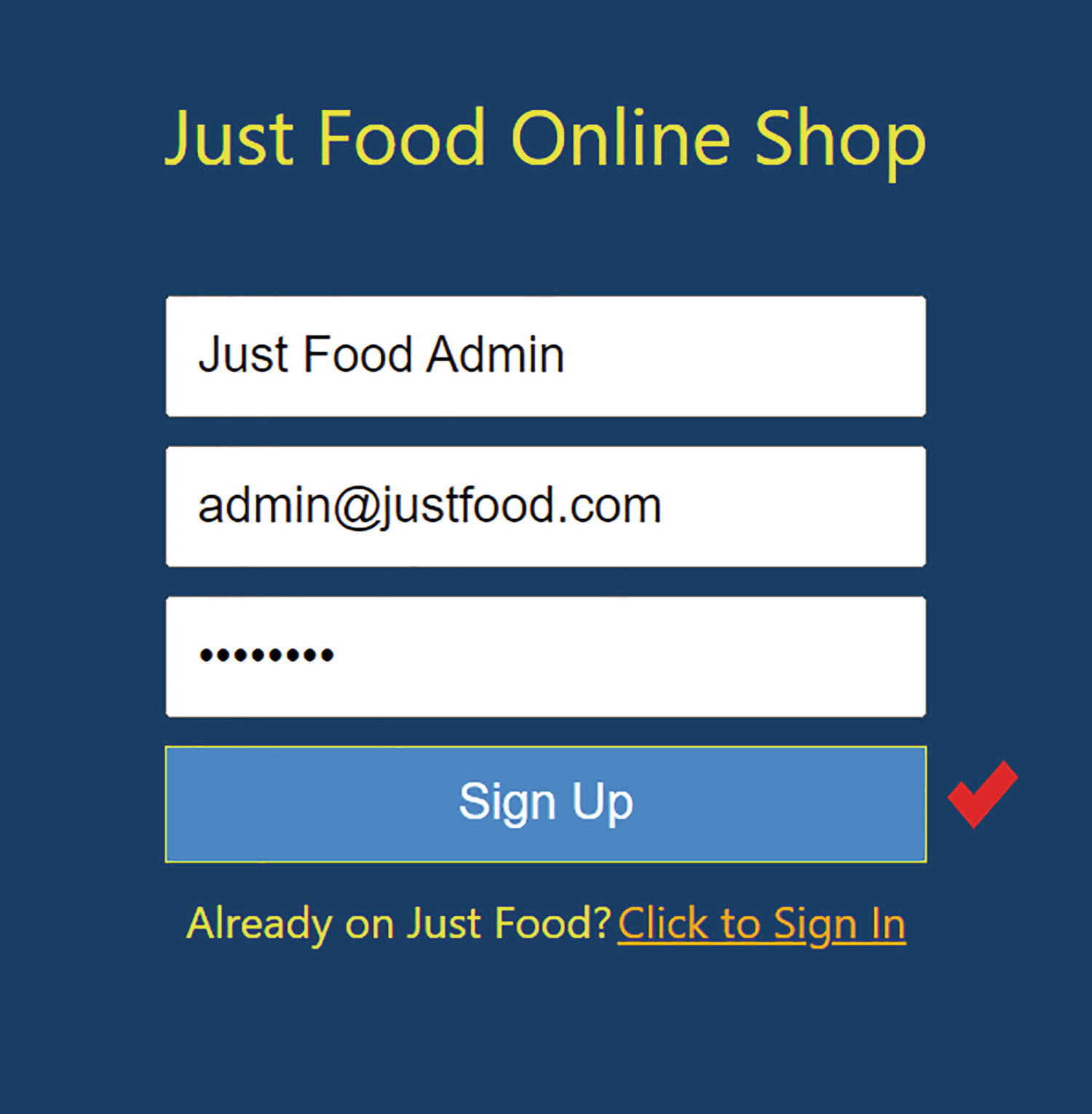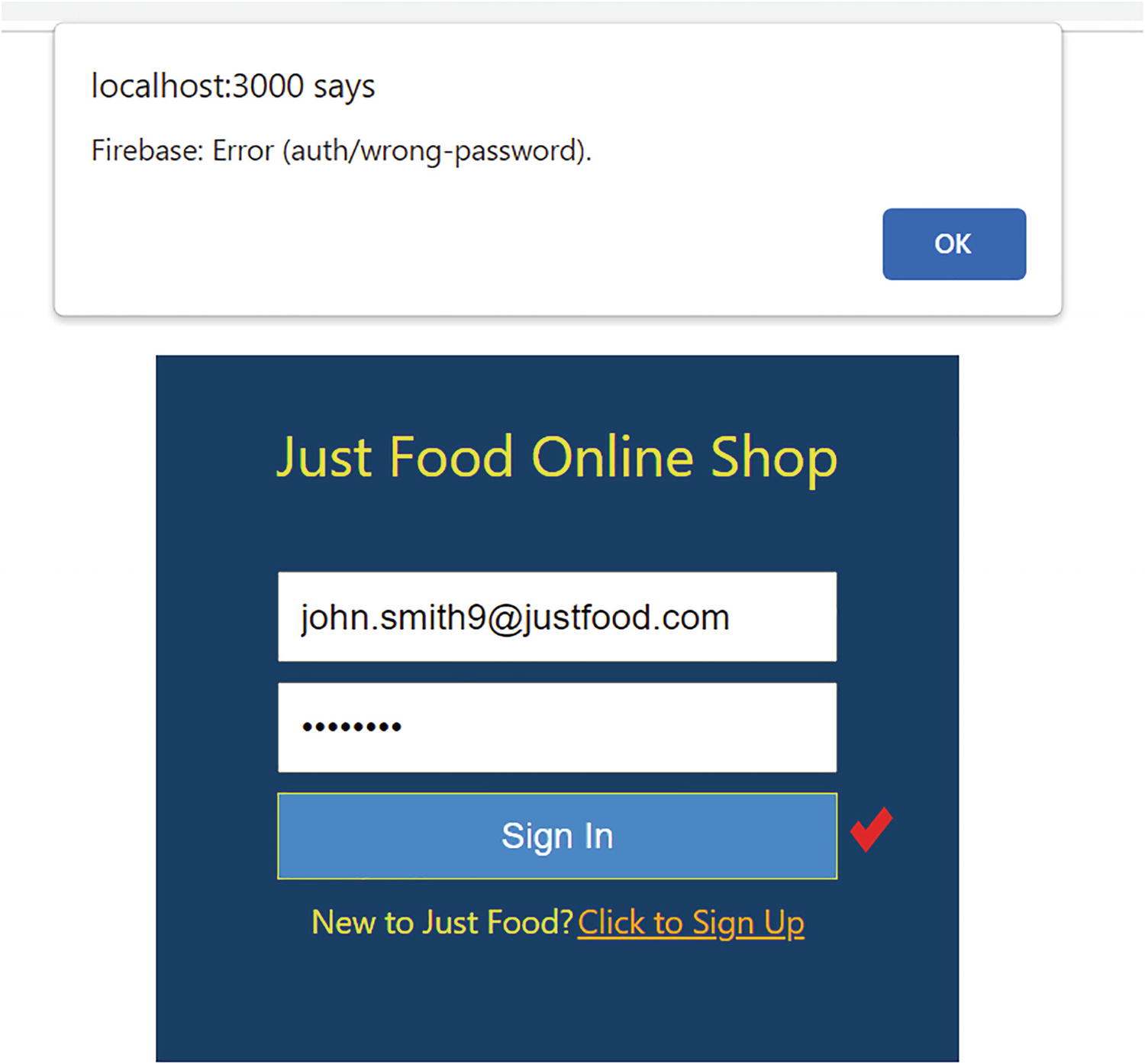 Firebase features built-in validations. For example, if you try to sign up the same user email again, for example, john.smith9@justfood.com, it will tell you that the email already exists. If you try to sign up with a wrong password, the wrong password alert will appear.