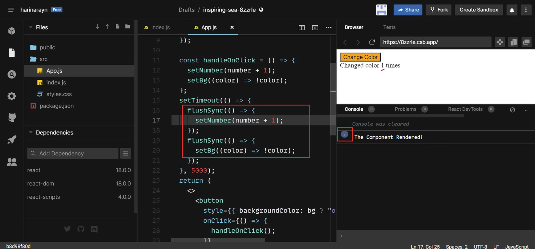 Even when clicking the button multiple times, you can see that only one re-render takes place per button click. So this proves that React 17 has this automatic batching capability for event handlers.