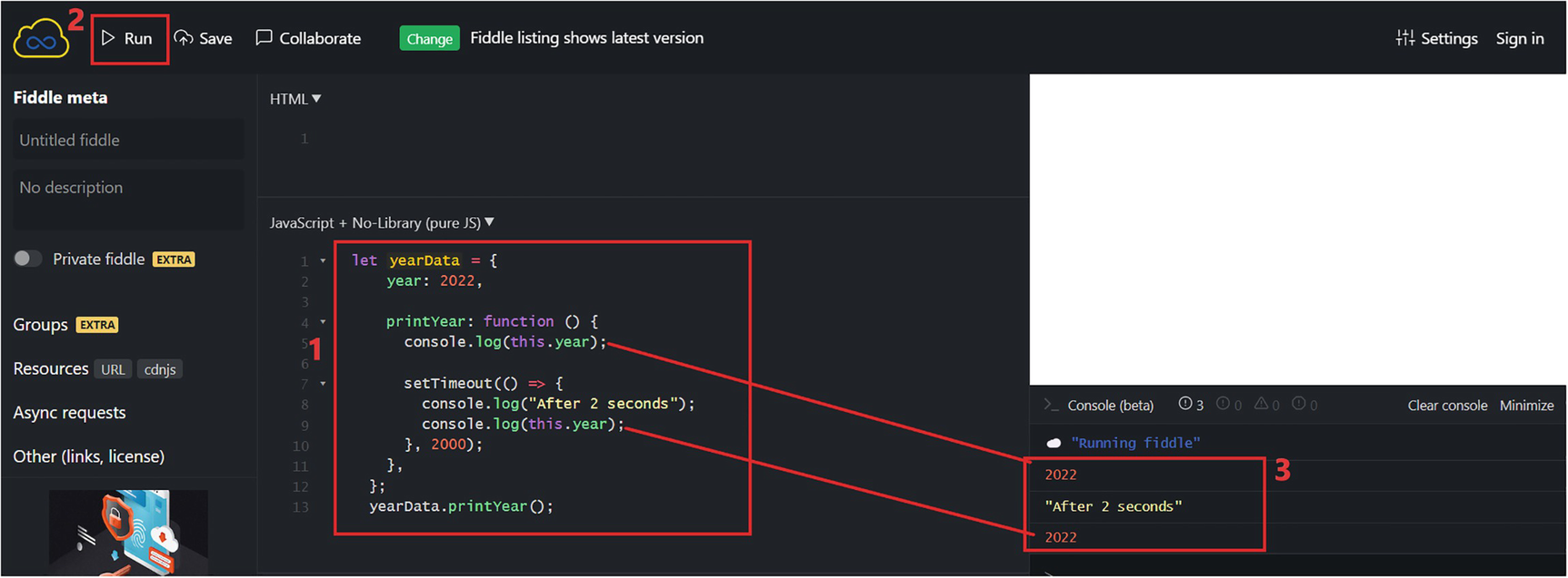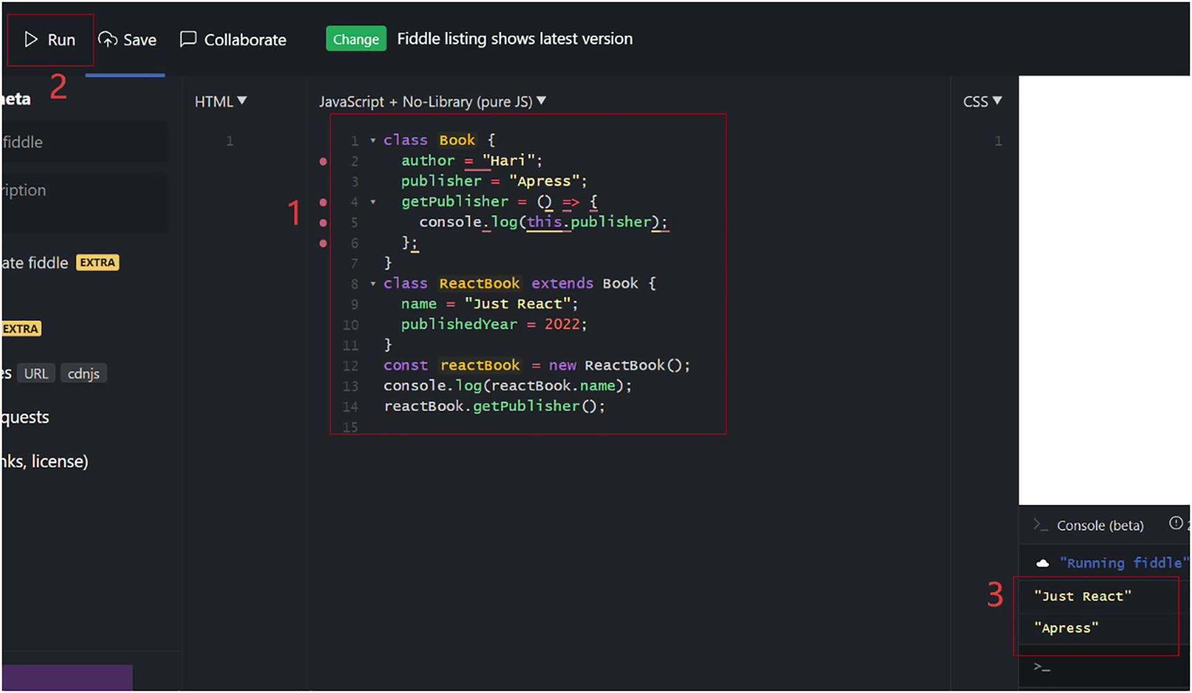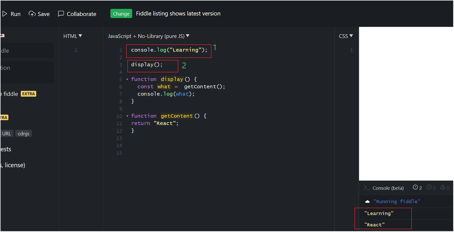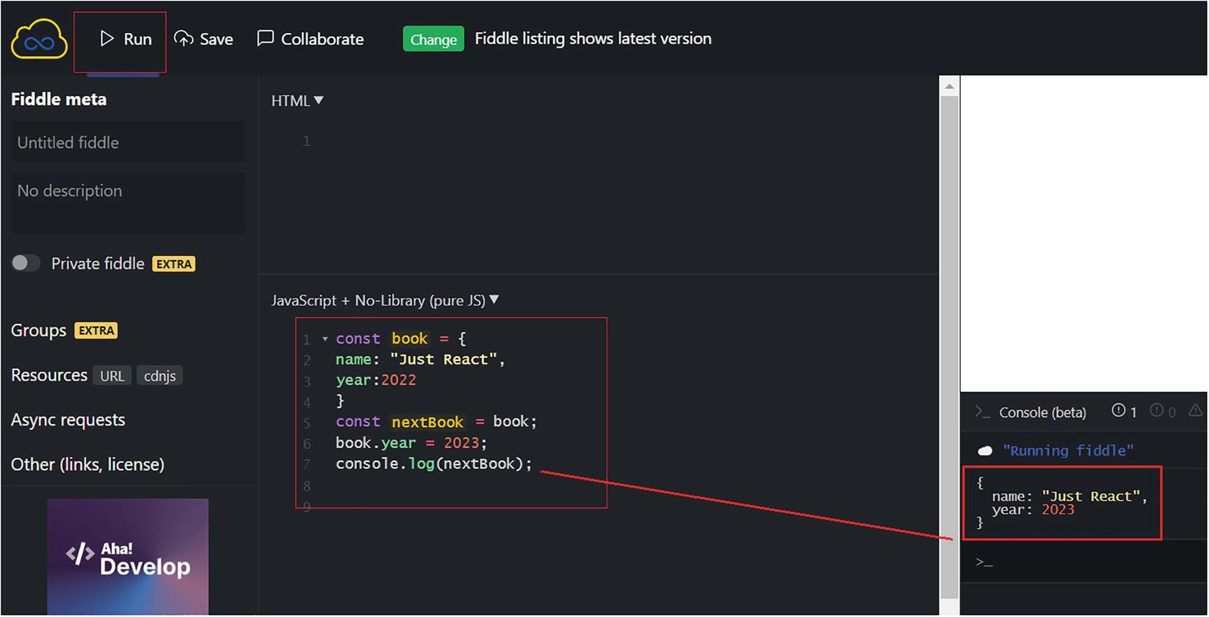 Now the bookName variable has a new value, Just JS. However, this will not have any effect on the variable newBookName. newBookName will still have the value Just React. It means that the variable newBookName just copies a value from the variable bookName and its existence is independent of bookName. Let us check this in jsfiddle. We will make use of jsfiddle in this section to test JS code.
