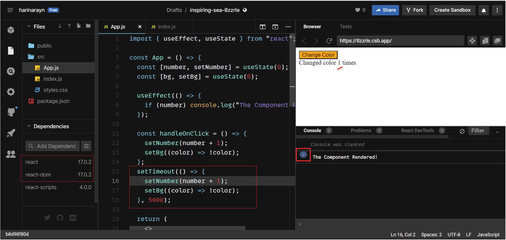 In this example, we have a button changing colors between light green and orange. Also, we have a span showing the number of times we changed the button color. In the useEffect method, we log the message The Component Rendered to the console. Note that we didn’t specify any dependency array to useEffect here since we need to call it after each re-render, not on first render. To skip the first render, we added a condition.