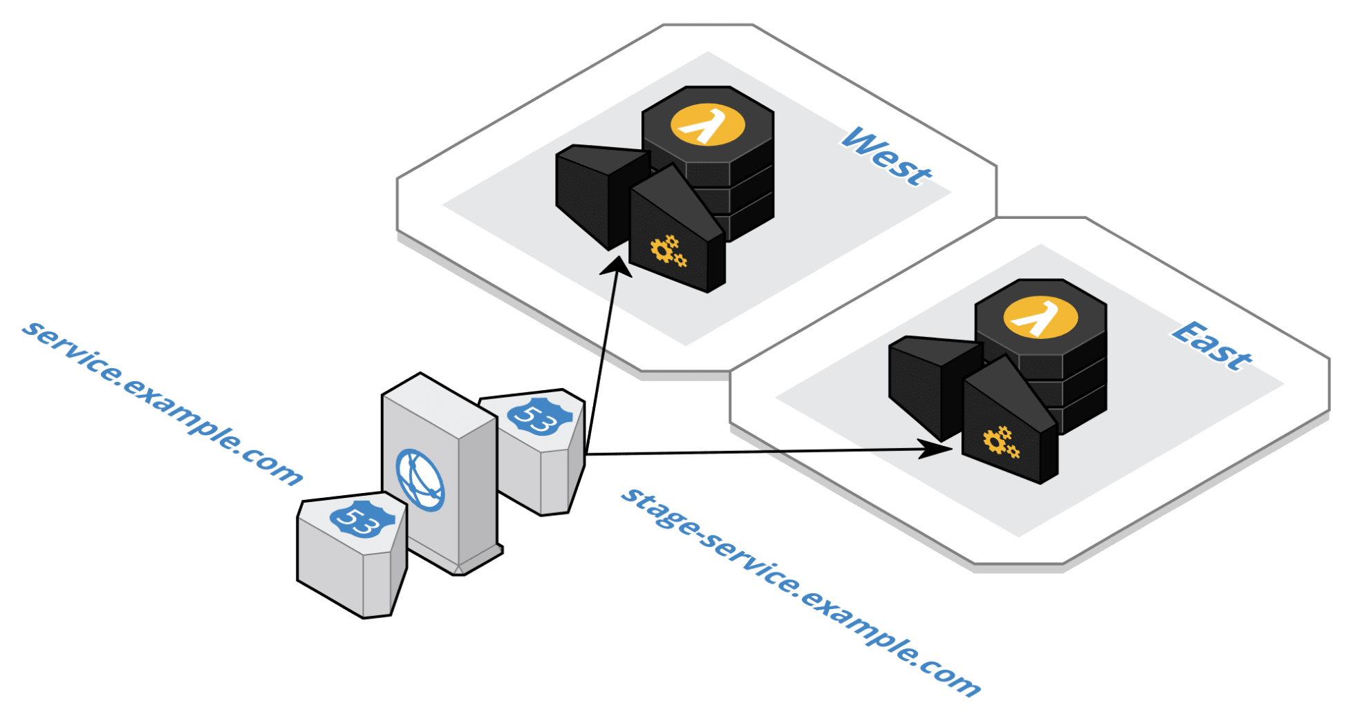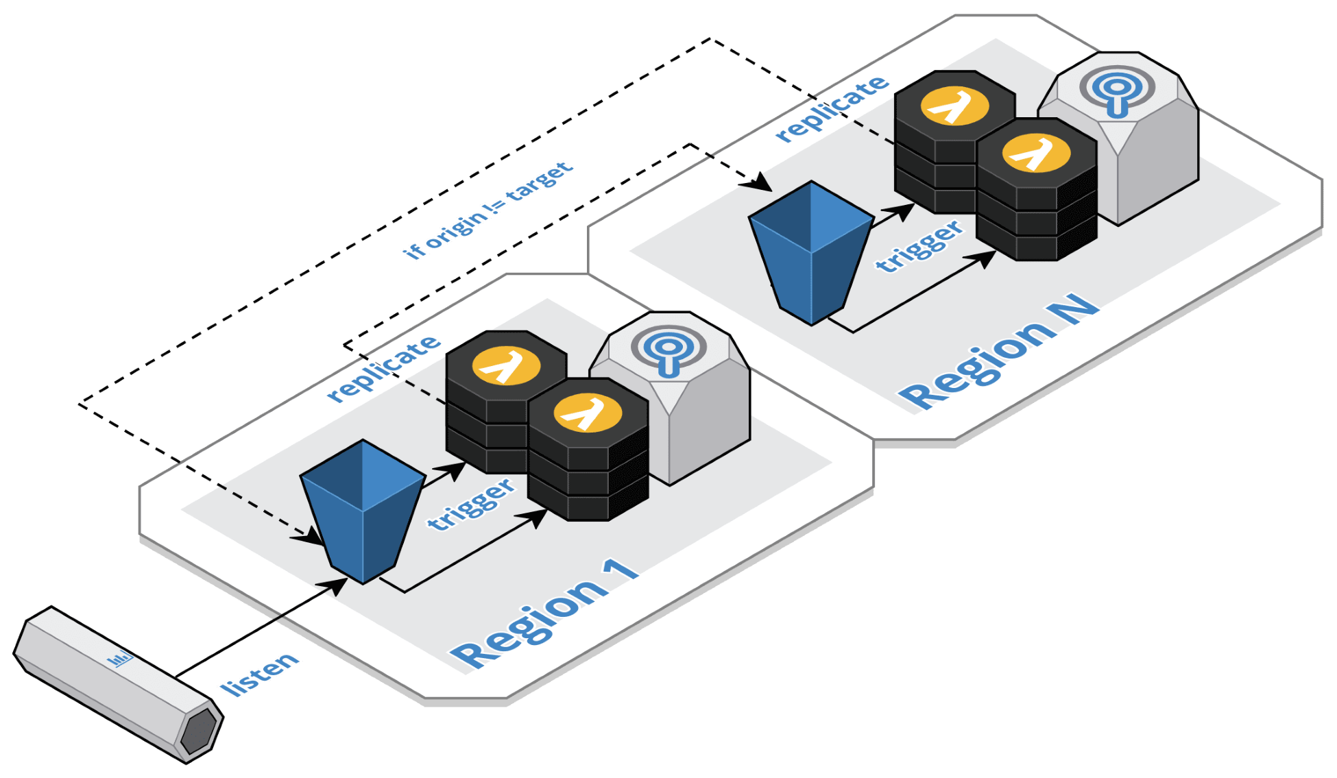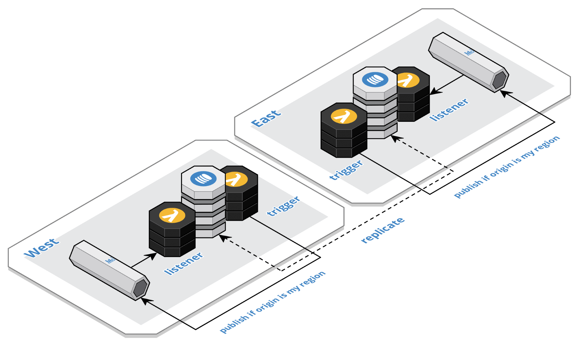 The service listens to the Kinesis Stream in the current region and writes the data to an S3 bucket in the current region, which generates an S3 trigger that is routed to an SNS topic. A function reacts to the topic and creates the materialized view in Elasticsearch in the current region. Meanwhile, a replicator function also reacts to the same topic. The replicator copies the contents of the object from the S3 bucket to the matching bucket in the next region, as specified by the REPLICATION_BUCKET_NAME environment variable. This in turn generates a trigger in that region. Once again, a function responds to the topic and creates the materialized view in Elasticsearch in that region as well. The replicator in that region also responds and looks to copy the object to the next region. This process of trigger and replicate will round robin for as many regions as necessary, until the forOrigin filter sees that the origin bucket (that is, uow.object.Metadata.origin) is equal to the target of the current replicator (that is, process.env.REPLICATION_BUCKET_NAME). In this recipe, we have two regions—us-east-1 and us-west-2. The data originates in the east region, so the east replicator copies the data to the west bucket (1cqxst40pvog4). The west replicator does not copy the data to the east bucket (1a3rh4v9tfedw) because the origin is the east bucket.