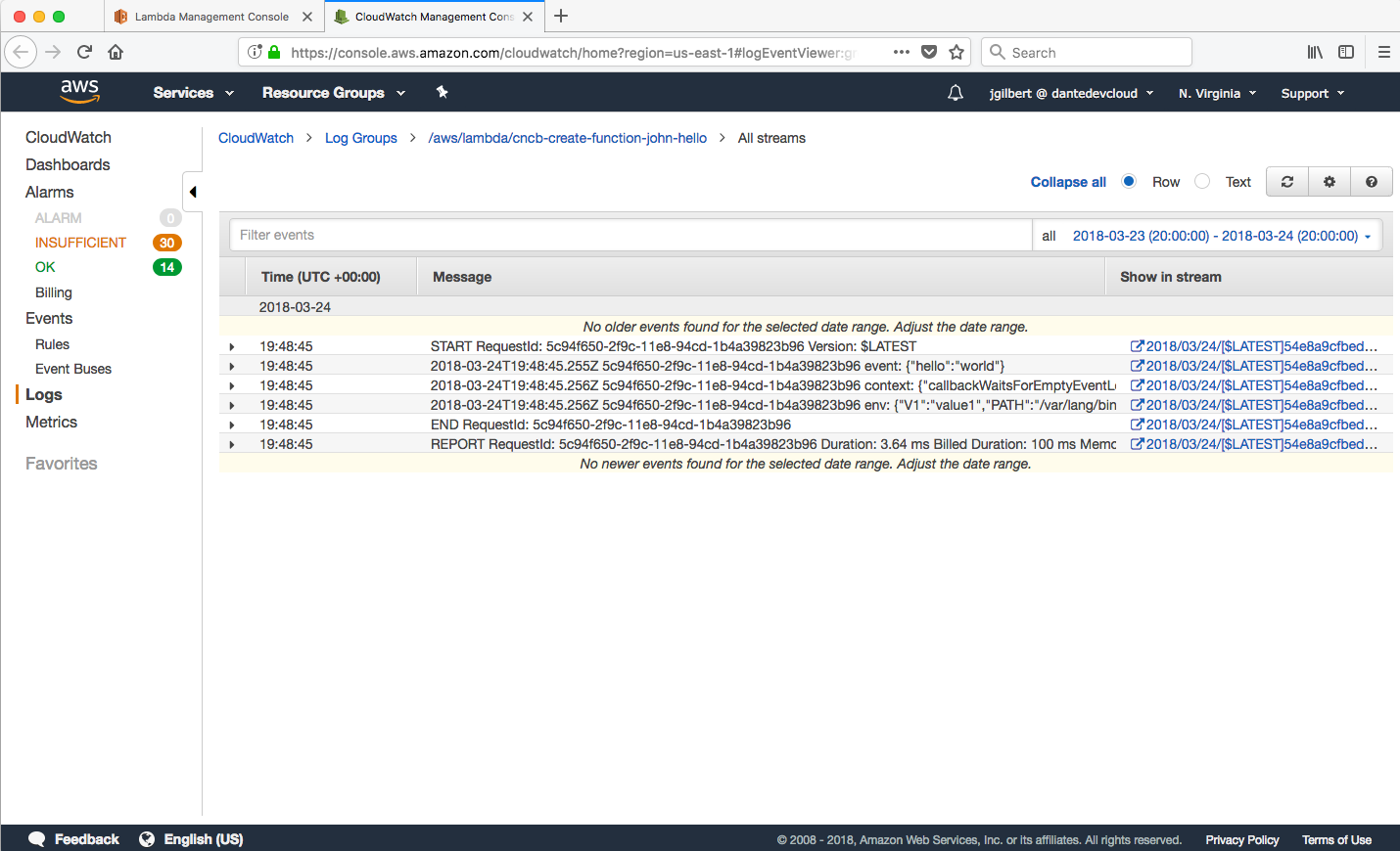 $ sls logs -f hello -r us-east1 -s $MY_STAGE